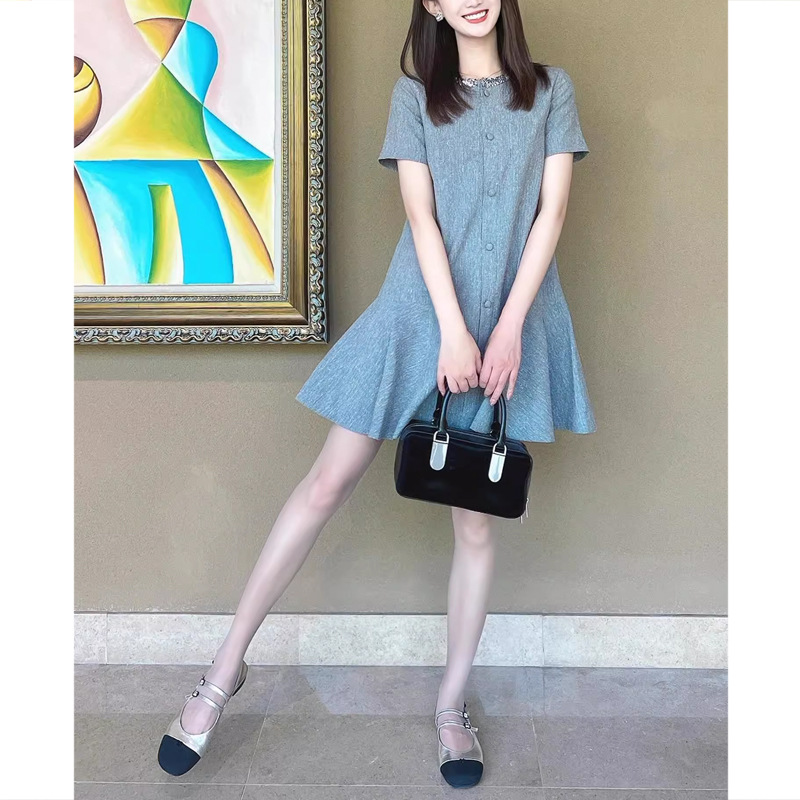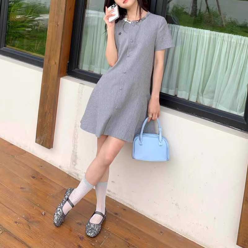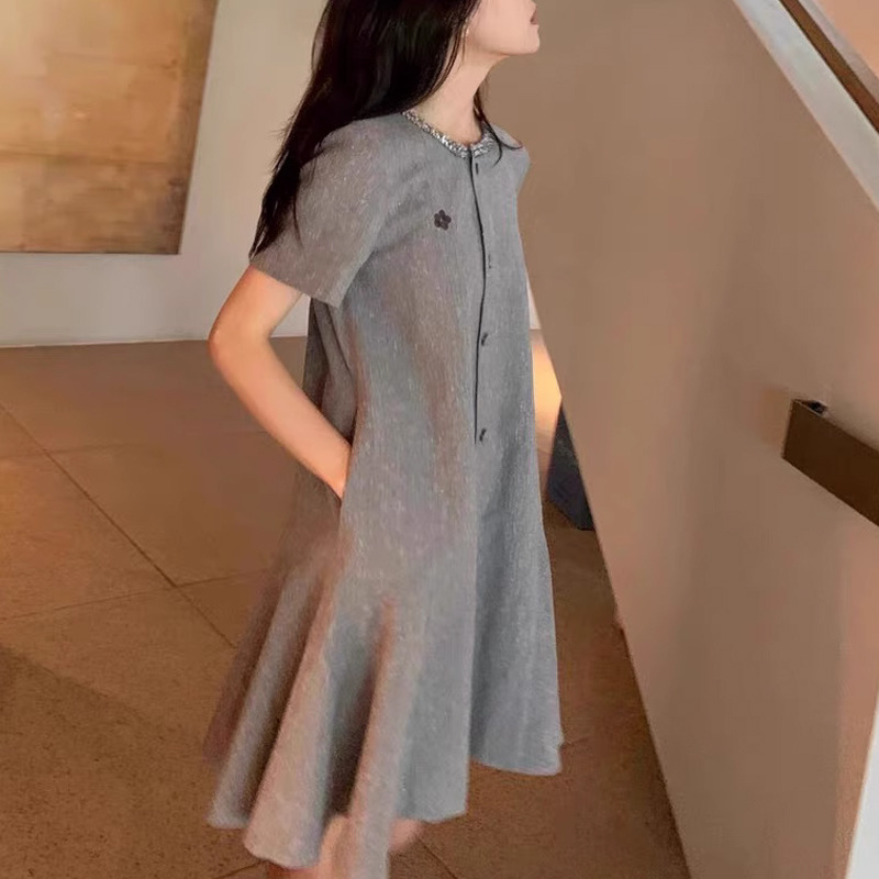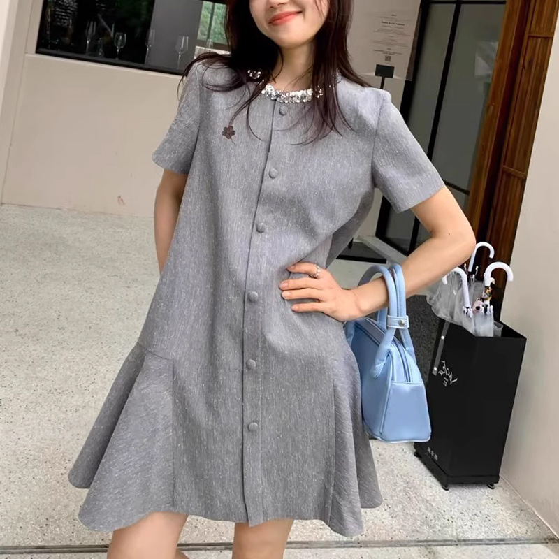 名媛法式24/SS 高ji感气质真丝亚麻亮片领口设计小香风连衣裙女夏