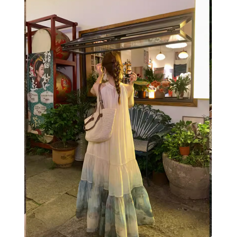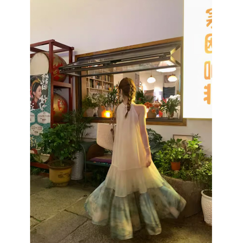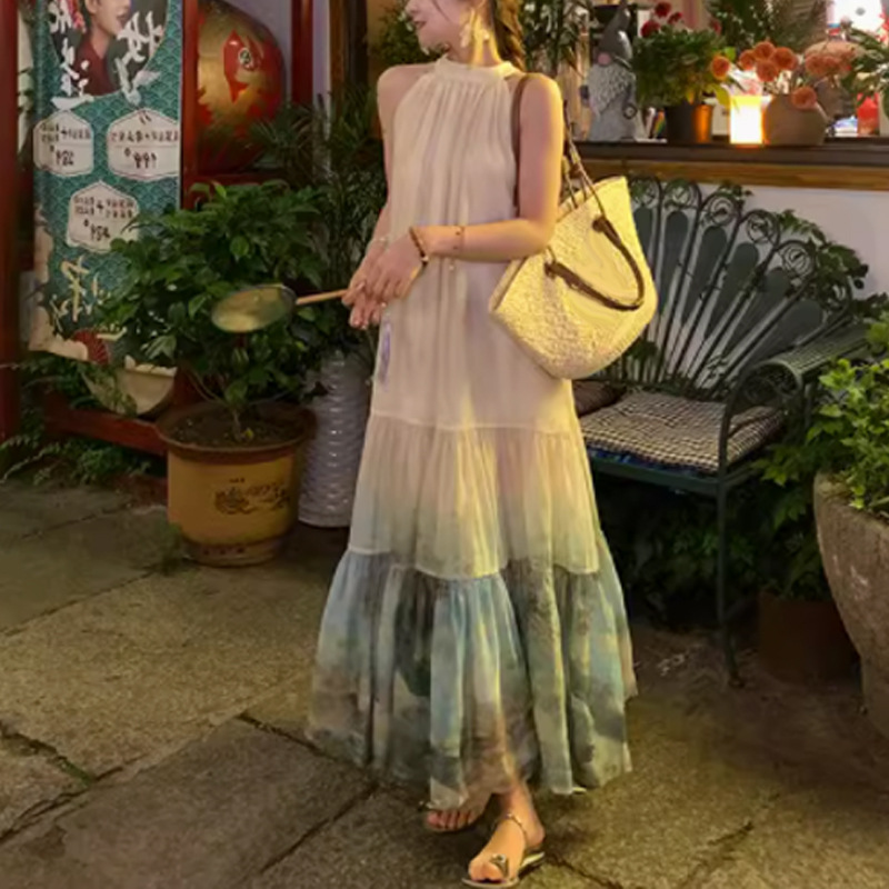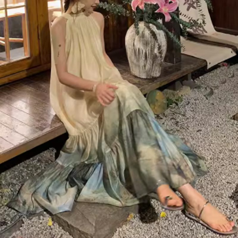【千里江山】新中式国风挂脖无袖A字度假大摆连衣裙