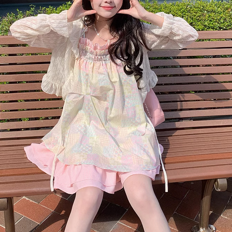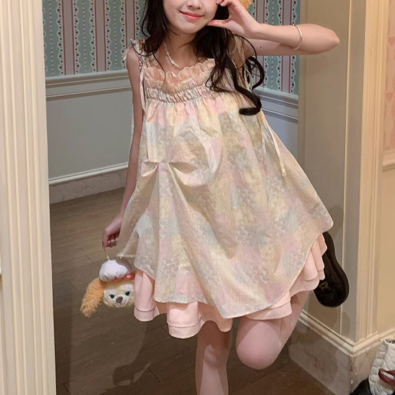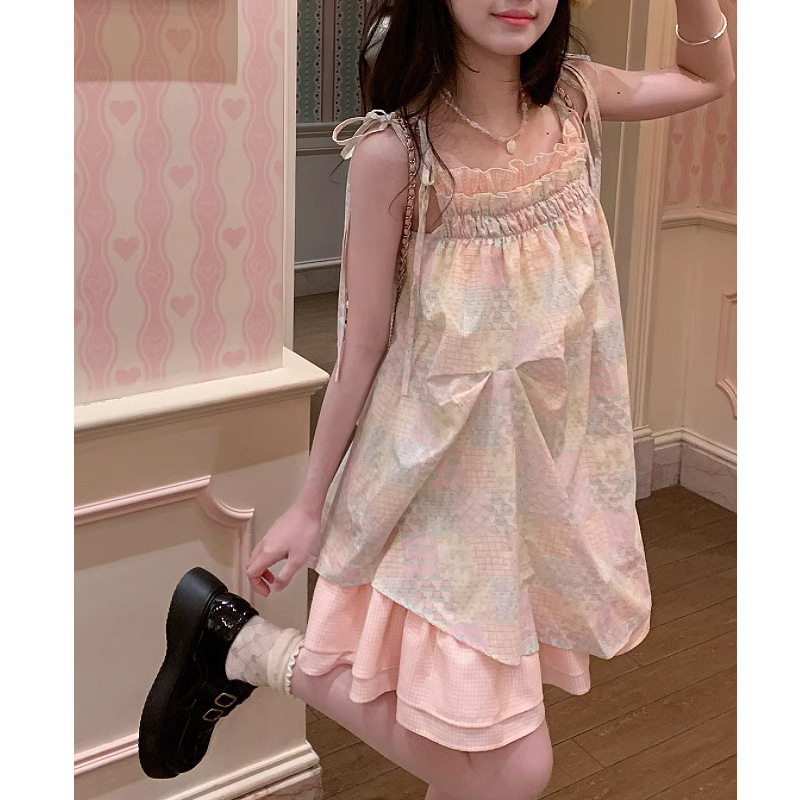 糖果日系度假印花粉紫拼布古着感温柔甜美清新吊带裙女夏新款