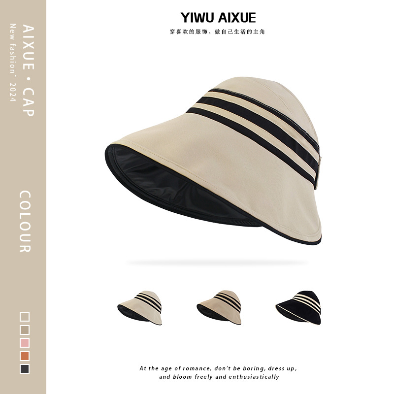 条纹渔夫帽女夏季防紫外线黑胶太阳帽可折叠遮阳百搭大檐空顶帽子