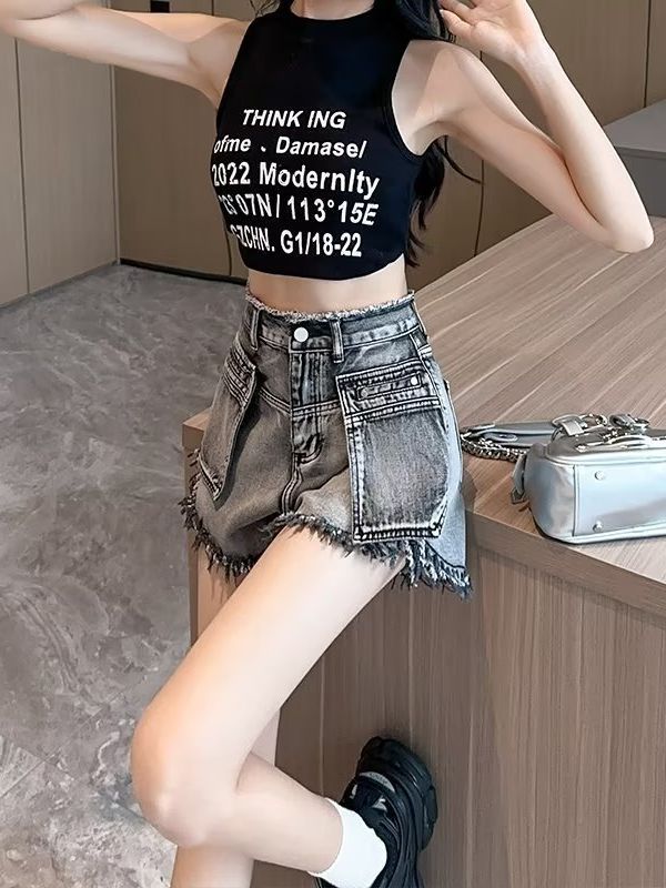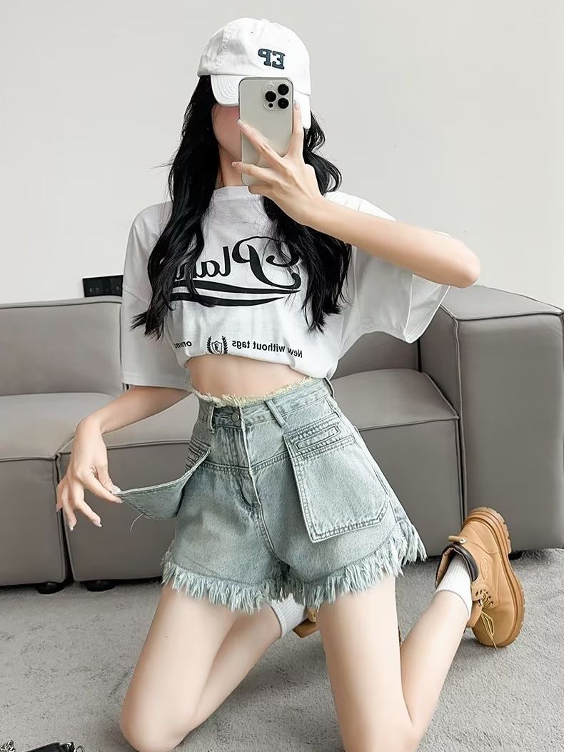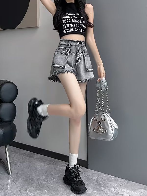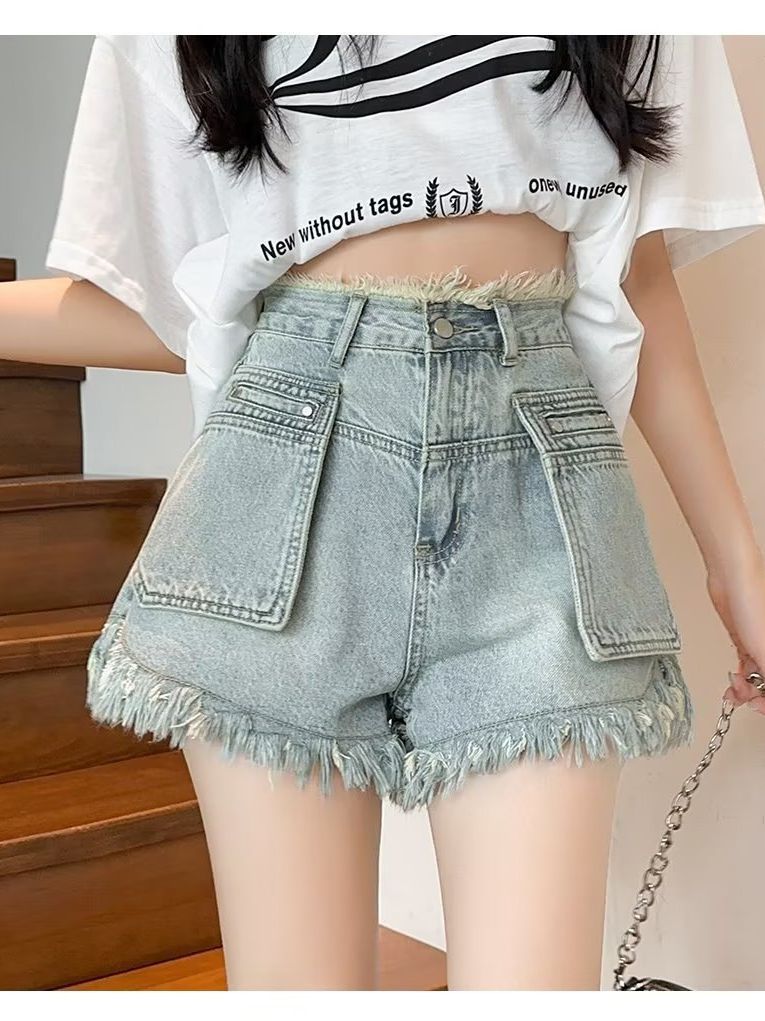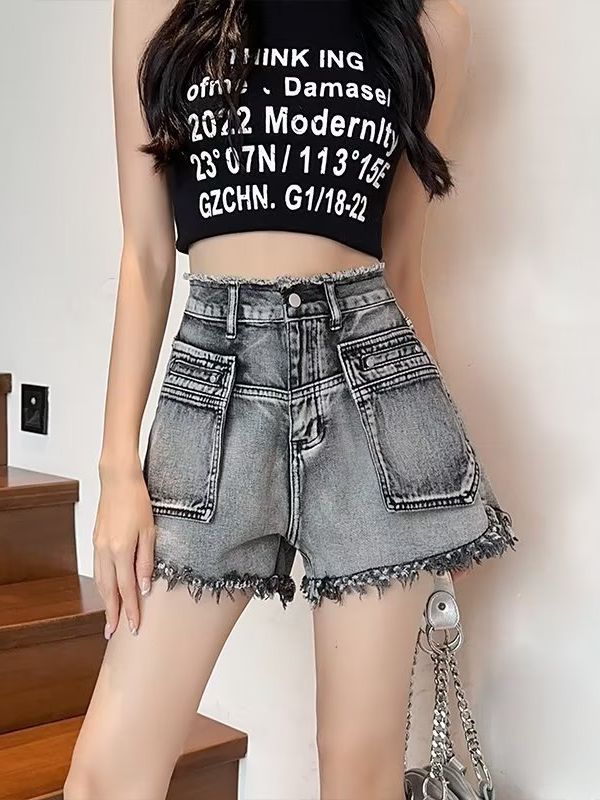 流苏牛仔短裤女夏季薄高腰宽松阔腿毛边大口袋设计感a字辣妹热裤