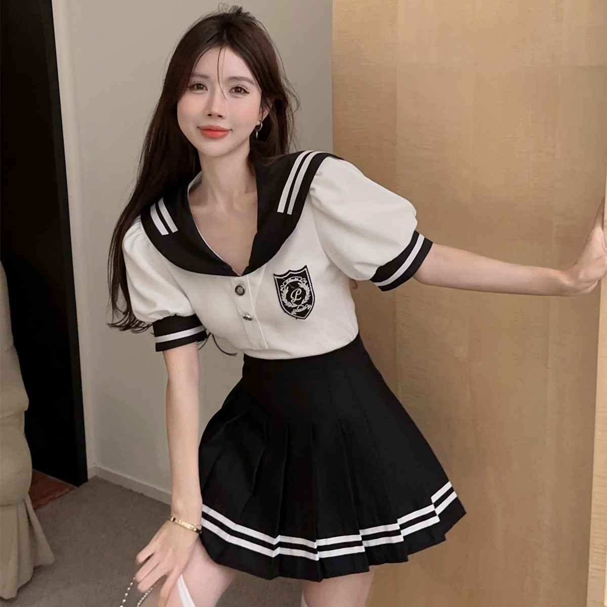 学院风jk制服套装女小个子夏季海军领泡泡袖上衣显瘦百褶裙两件套