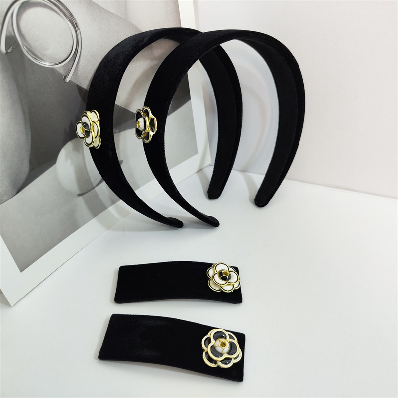 韩国新款黑色金丝绒小香风山茶花发箍简约百搭发夹BB夹碎发侧边夹