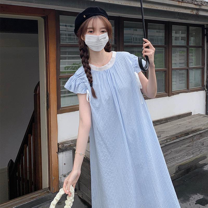 实拍宽松显瘦荷叶袖文艺减龄拼色圆领蓝色格纹后背系带中长连衣裙
