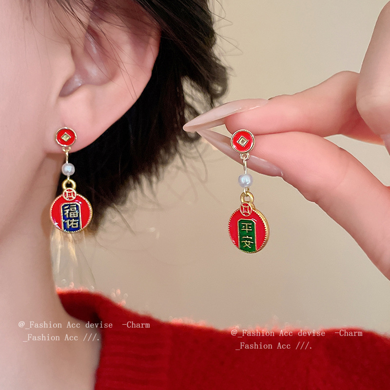银针滴油圆形铜钱珍珠耳钉女小众简约设计耳环新中式气质百搭耳饰