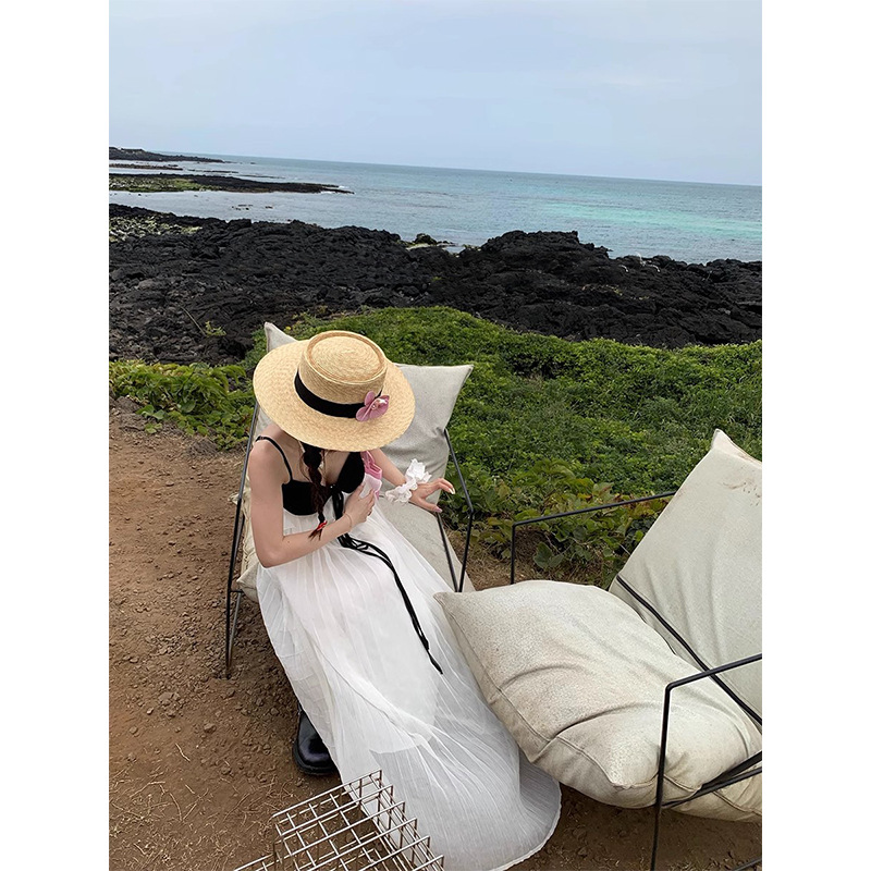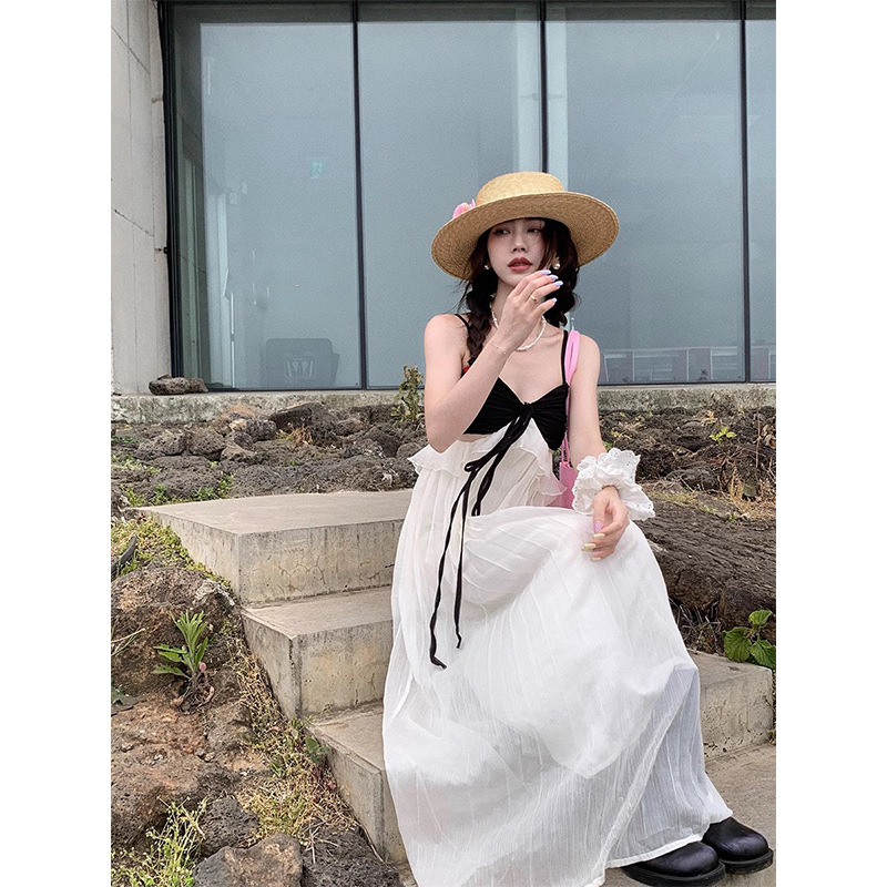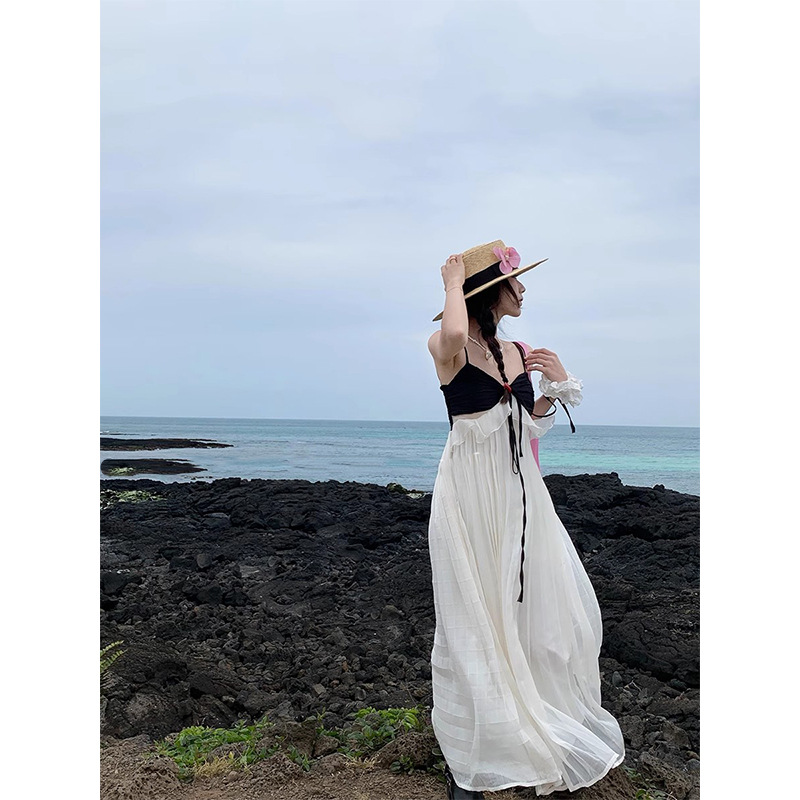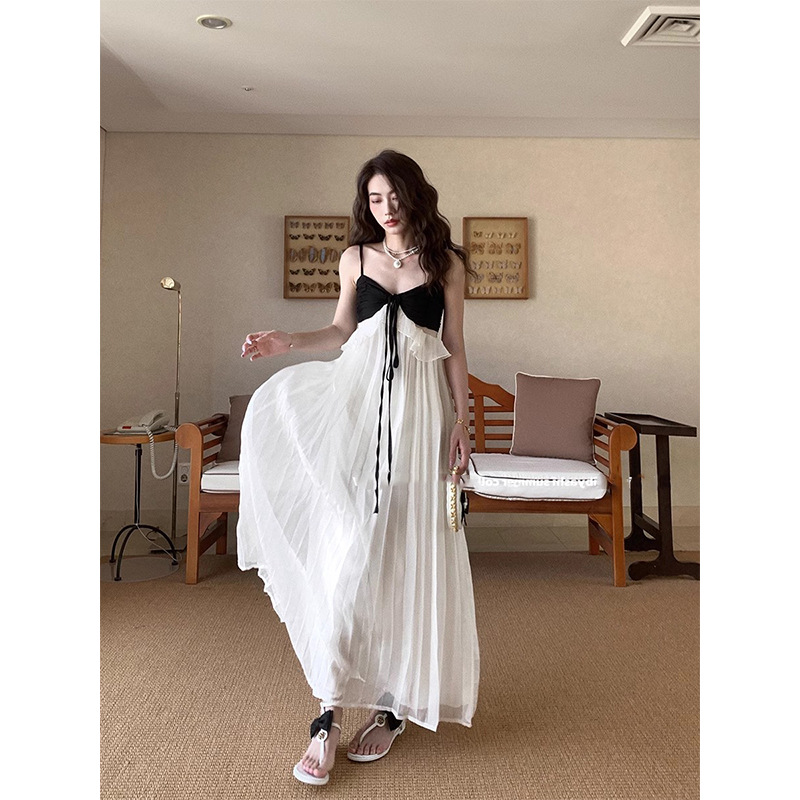 仲夏未眠夜 法式度假风吊带裙绝美黑白拼接大摆连衣裙夏