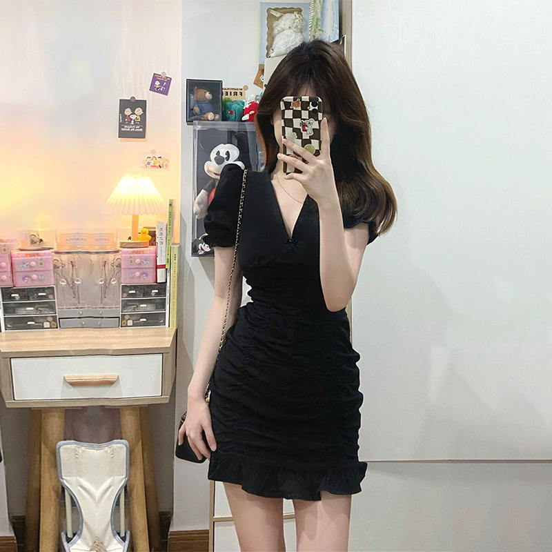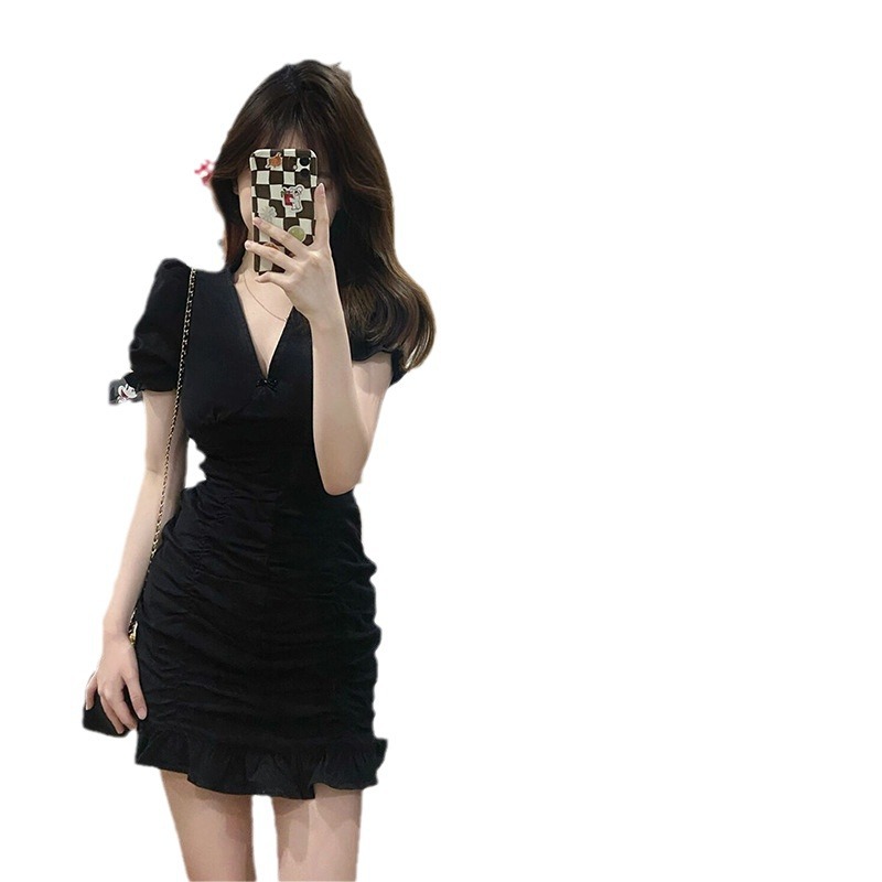夏季纯欲黑色收腰小个子V领连衣裙女设计感修身鱼尾包臀中短裙子