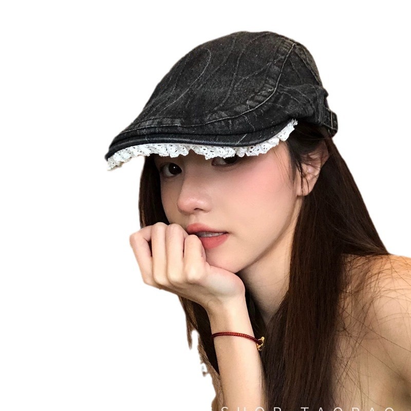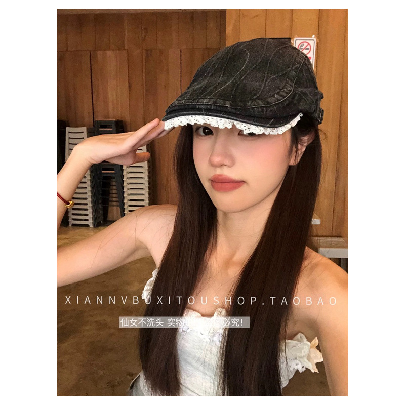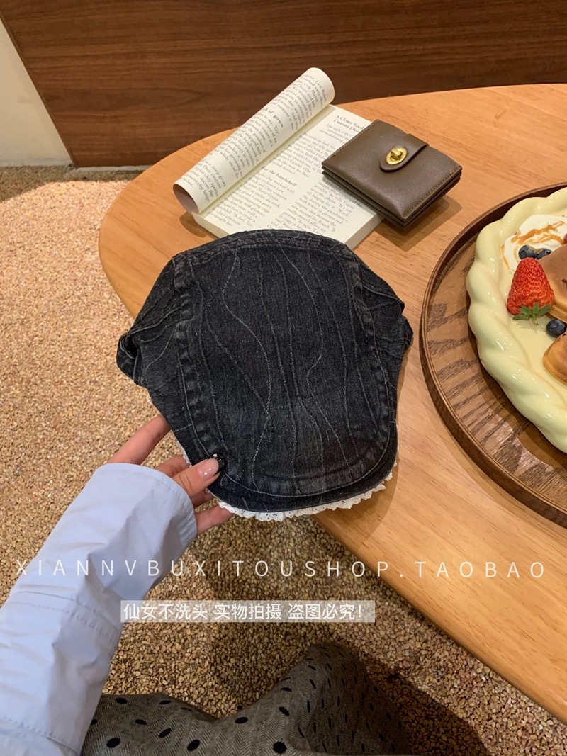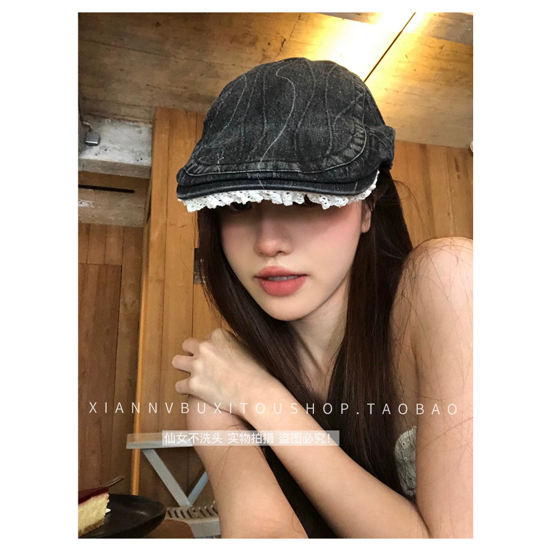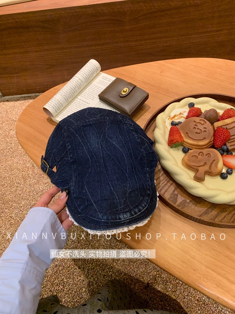 原创复古水洗牛仔做旧花边前进帽女大头围显脸小y2k鸭嘴贝雷帽子