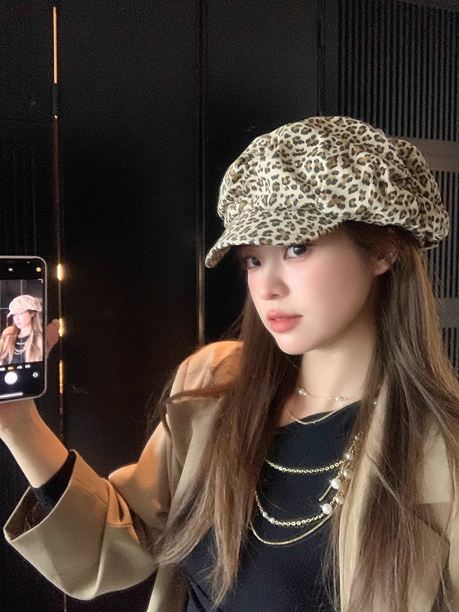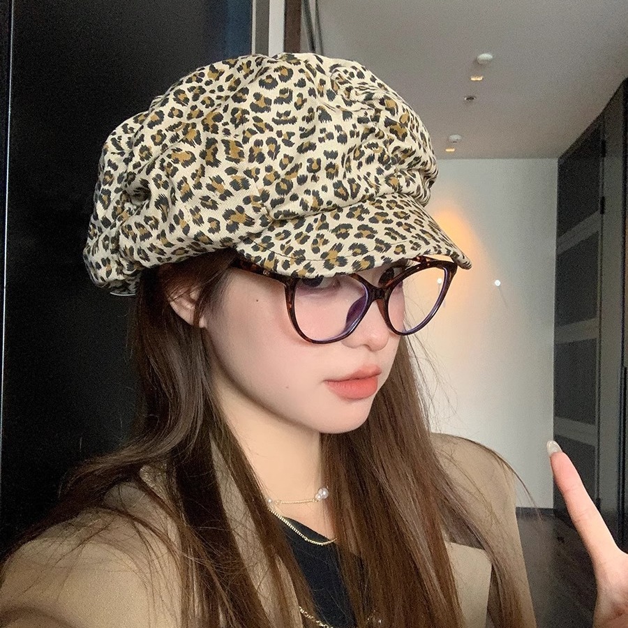 美式千禧风~古着豹纹贝雷帽女春夏户外街拍甜酷时髦鸭嘴八角帽子