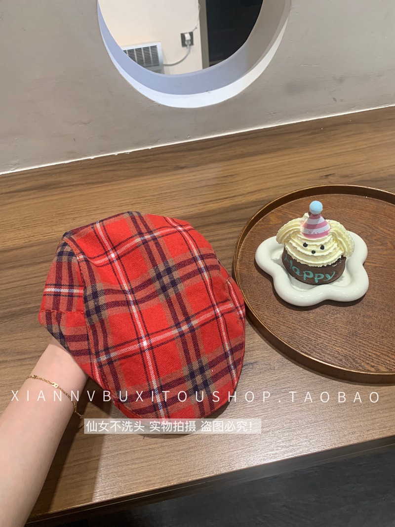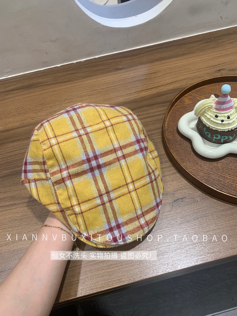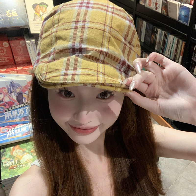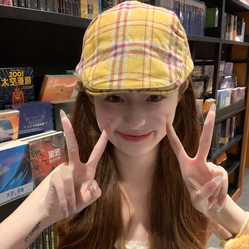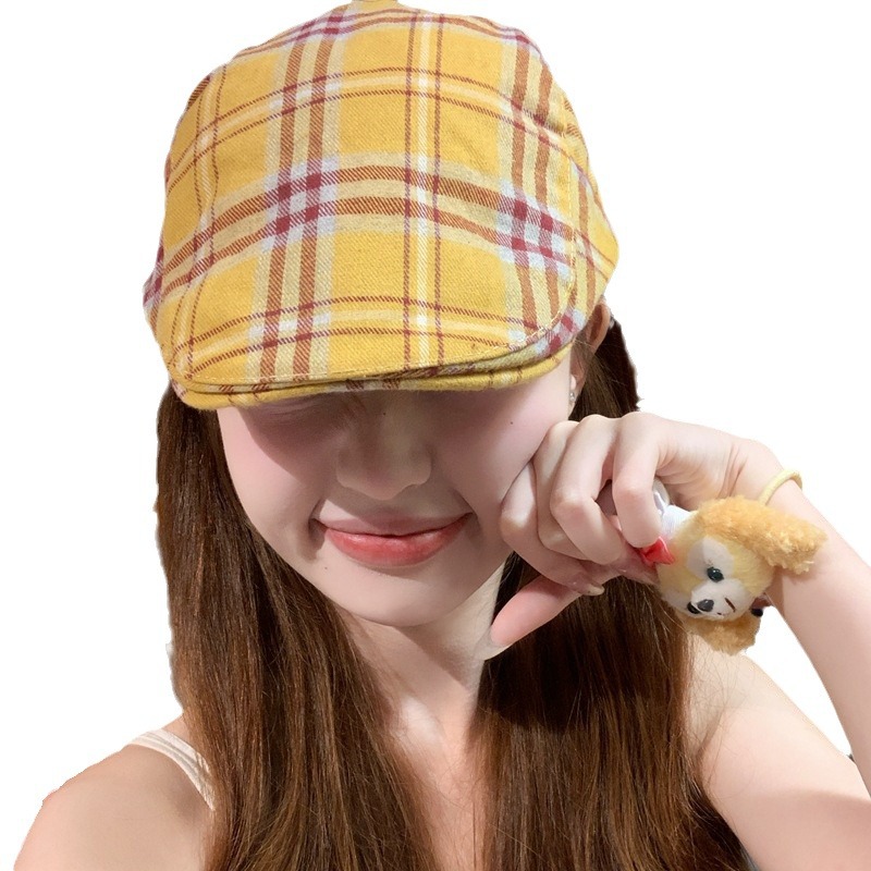 复古英伦格纹前进帽女艺术生反戴画家显脸小贝雷帽小众鸭嘴帽子潮