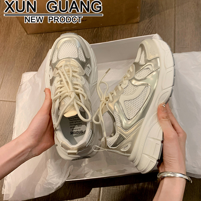 真皮松糕厚底网面透气老爹鞋女夏季新款百搭运动休闲跑步鞋