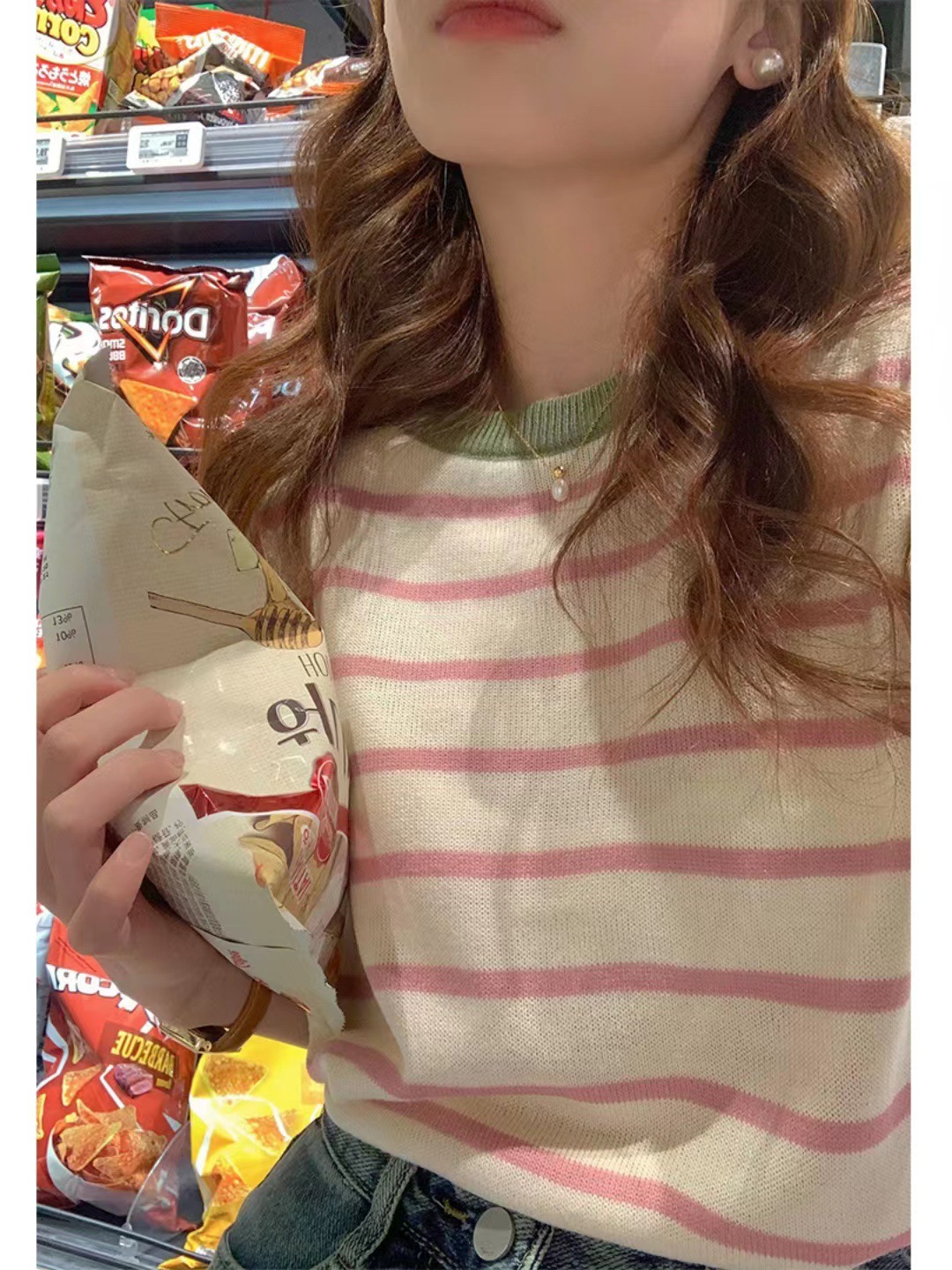 撞色条纹针织短袖女春夏新款韩版圆领套头T恤上衣ins