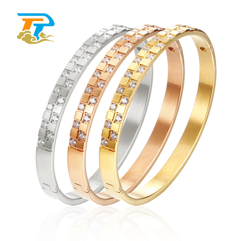 时尚镶钻手环 欧美风宽版小方格配饰 卡扣钛钢棋盘手镯女