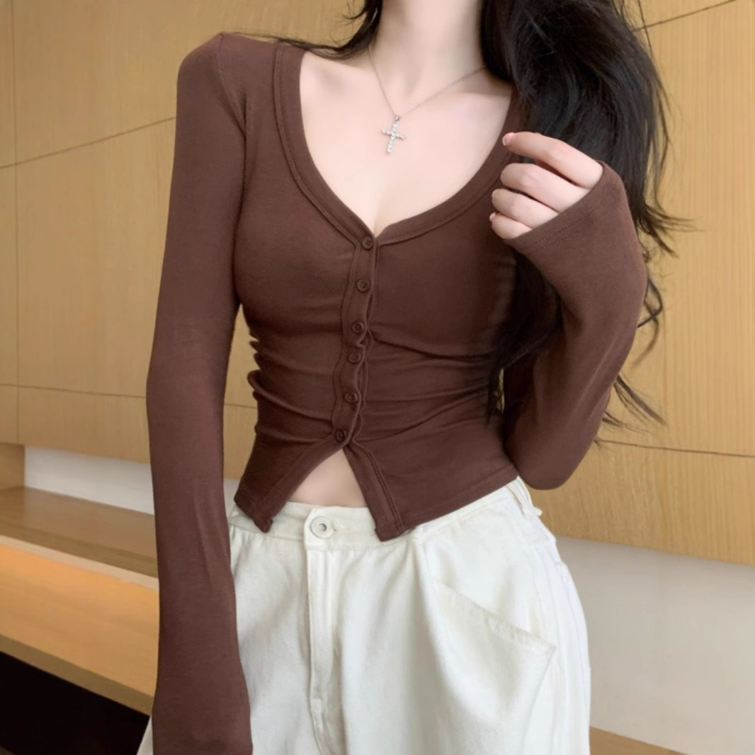 辣妹风v领长袖T恤女洋气时髦修身紧身内搭显瘦打底开衫短款上衣