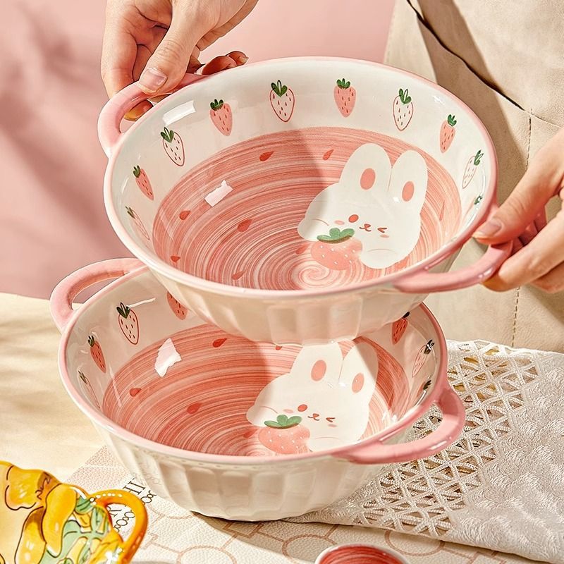 陶瓷双耳汤碗家用吃面碗汤面碗可爱少女心大号草莓兔子碗
