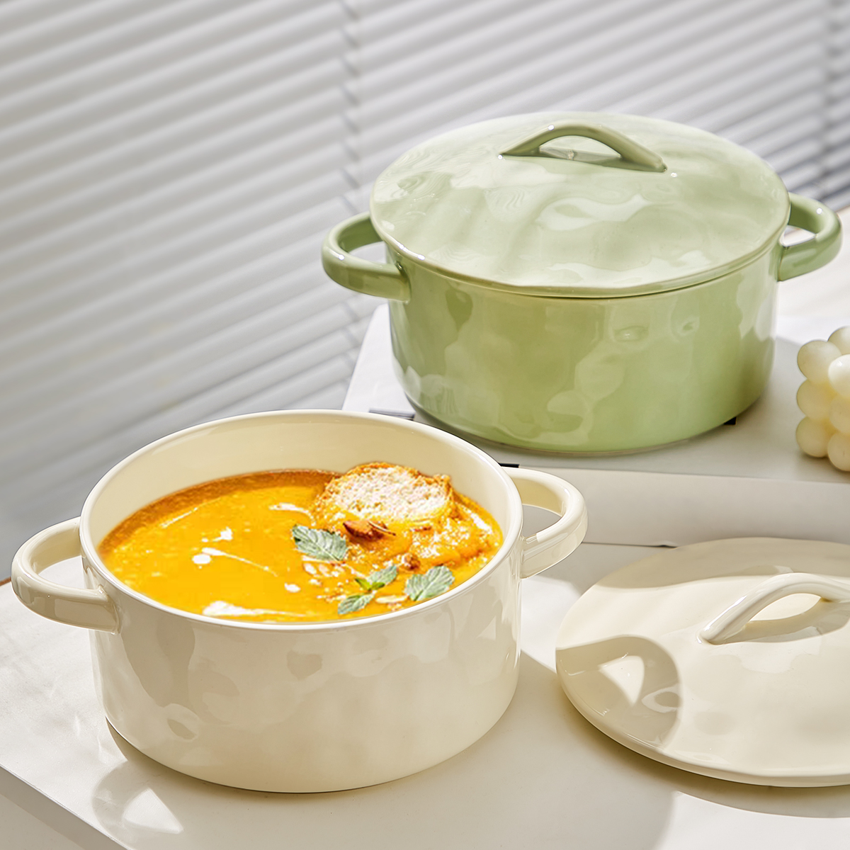 奶油风双耳汤碗家用新款陶瓷大汤盆带盖