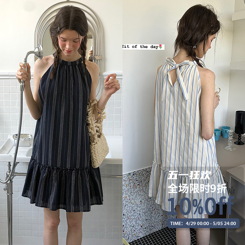 Letm薄雾的初夏清晨’复古挂脖蝴蝶结系带下摆荷叶边无袖连衣裙女