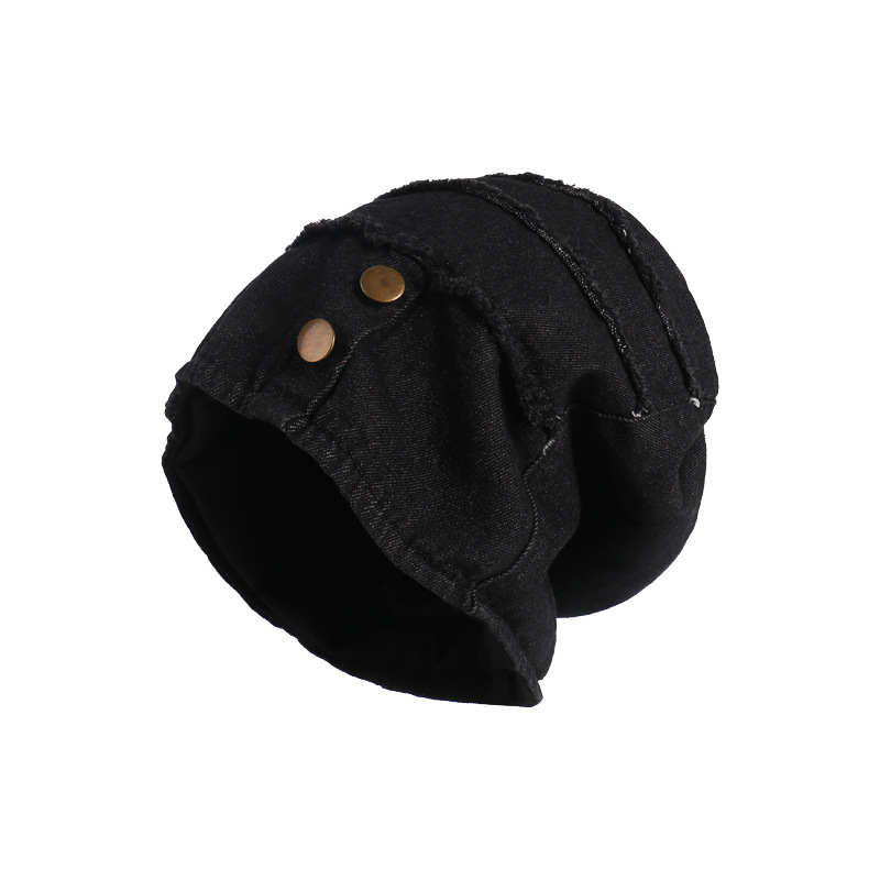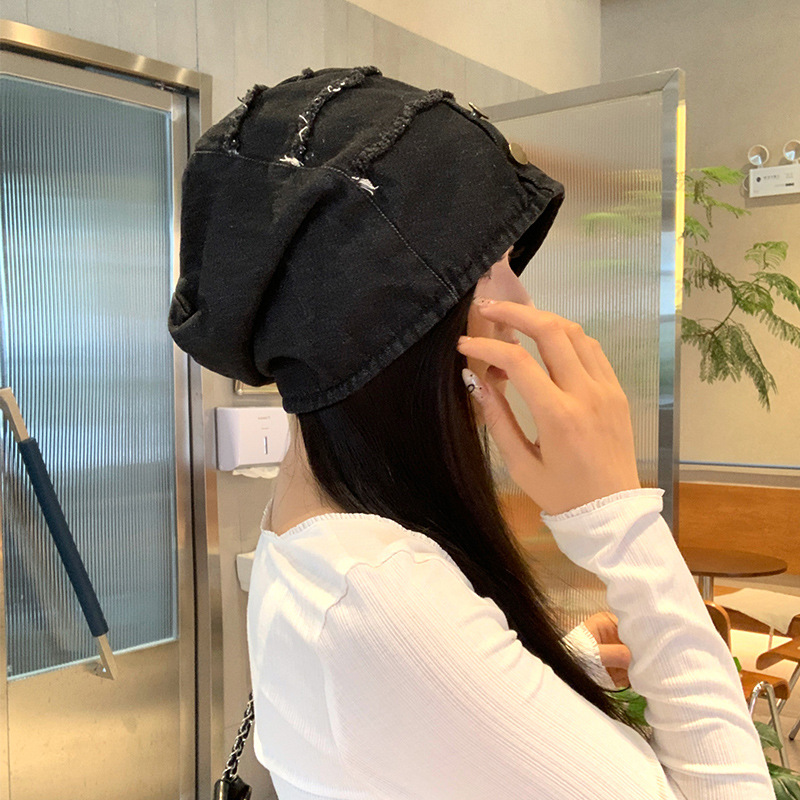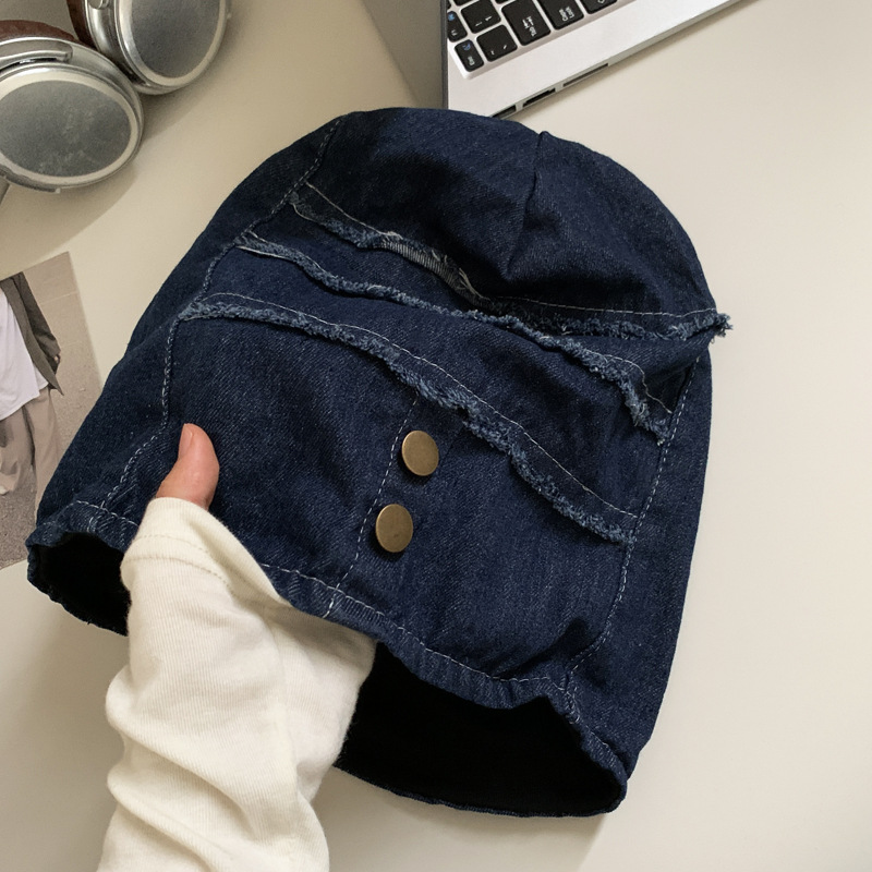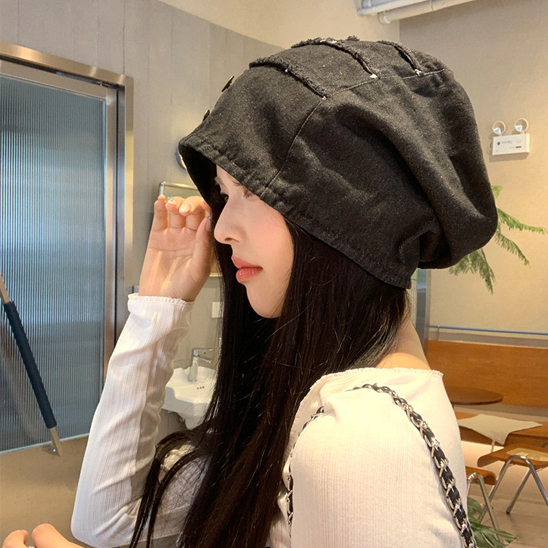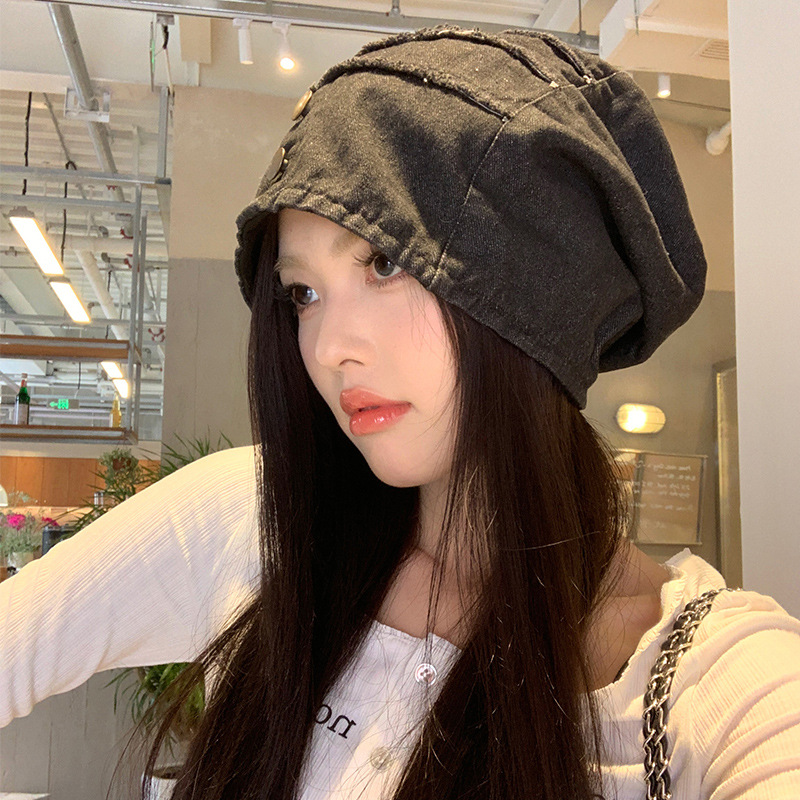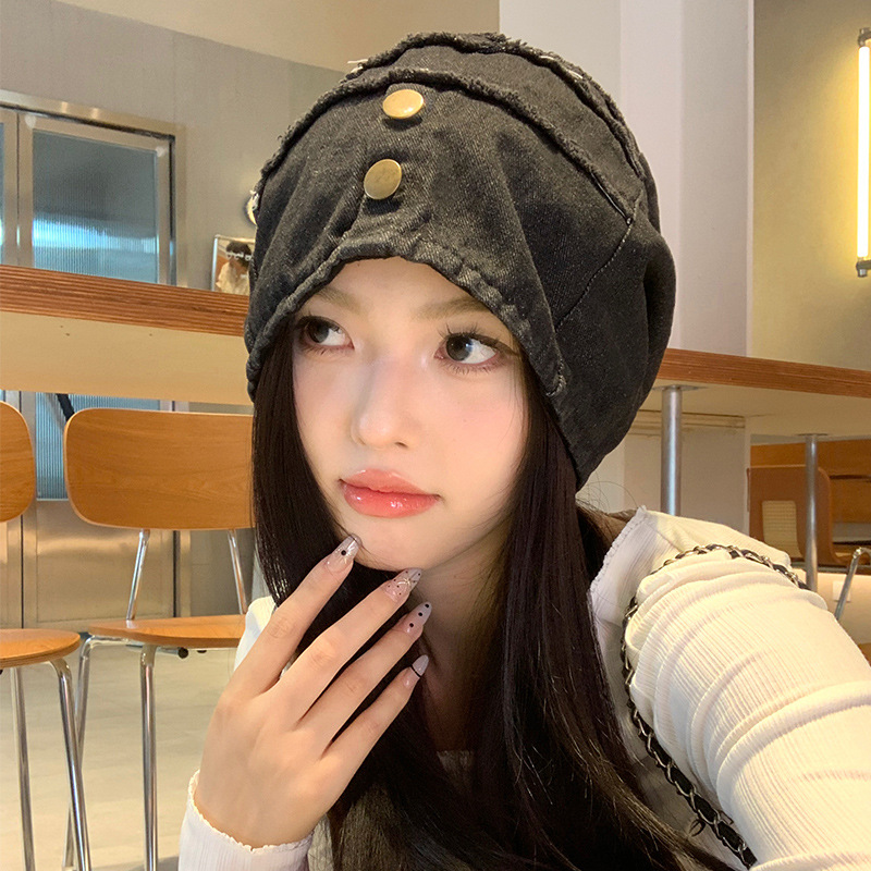 韩版复古做旧纽扣毛边牛仔堆堆帽女新款大头围显脸小包头帽潮
