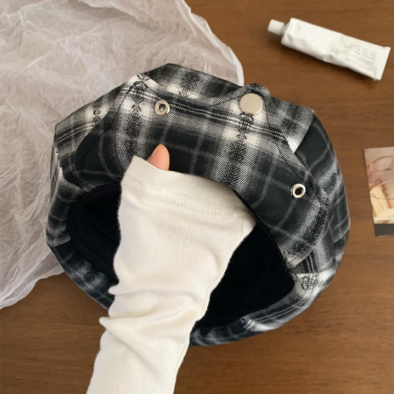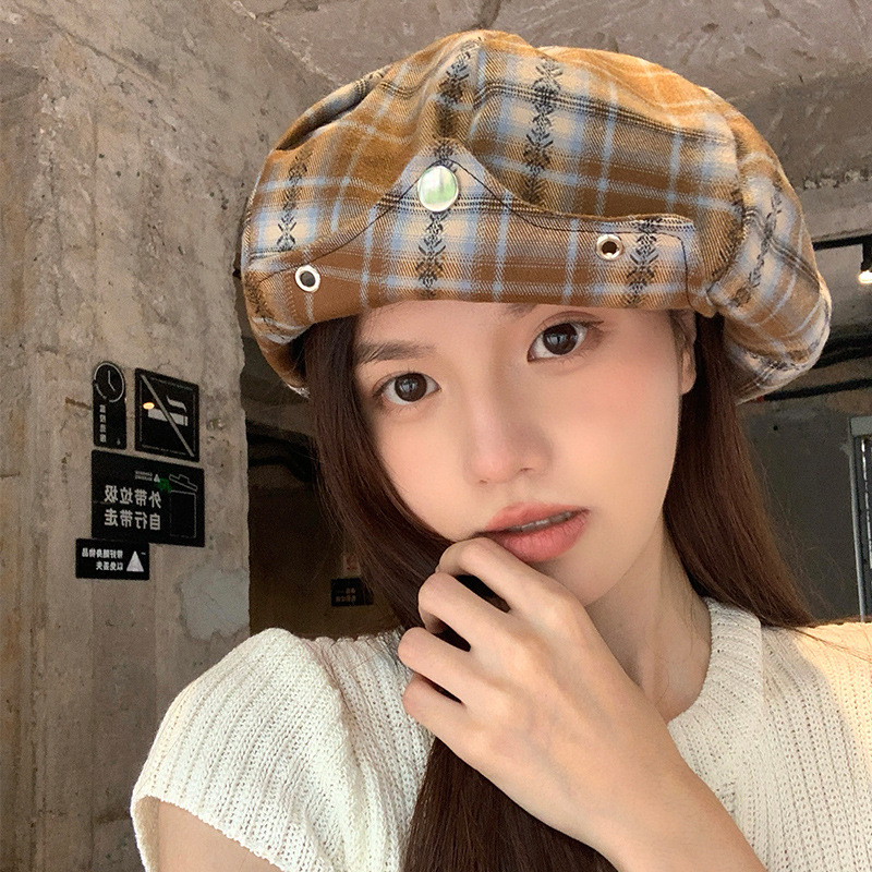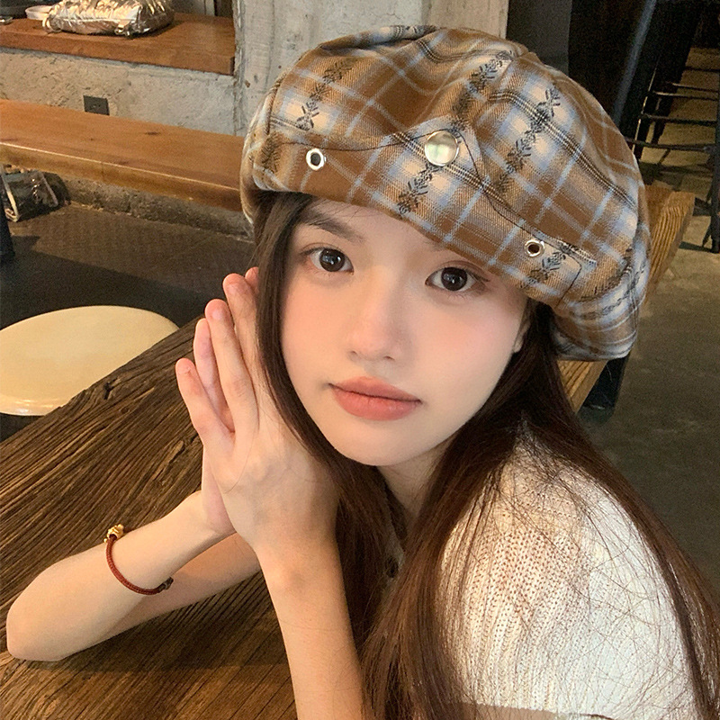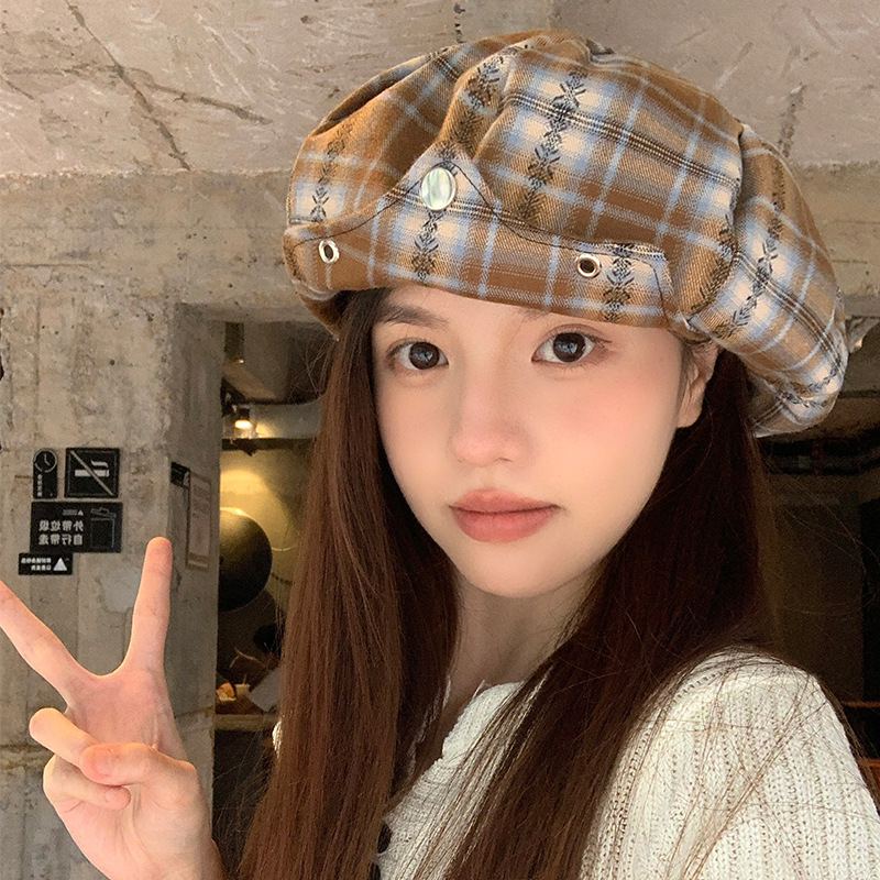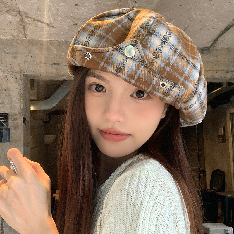 日系复古格纹云朵贝雷帽女小众时尚百搭氛围感显脸小报童八角帽子