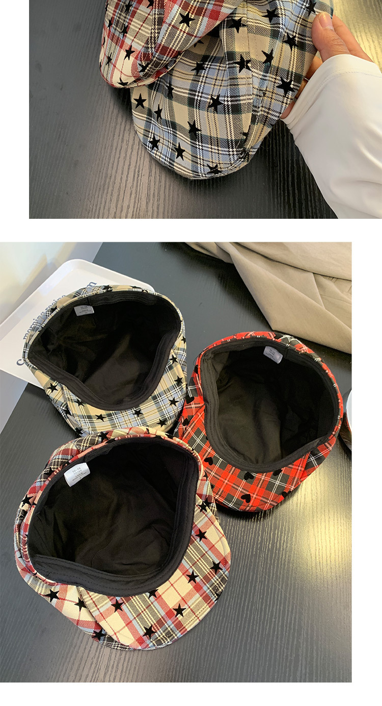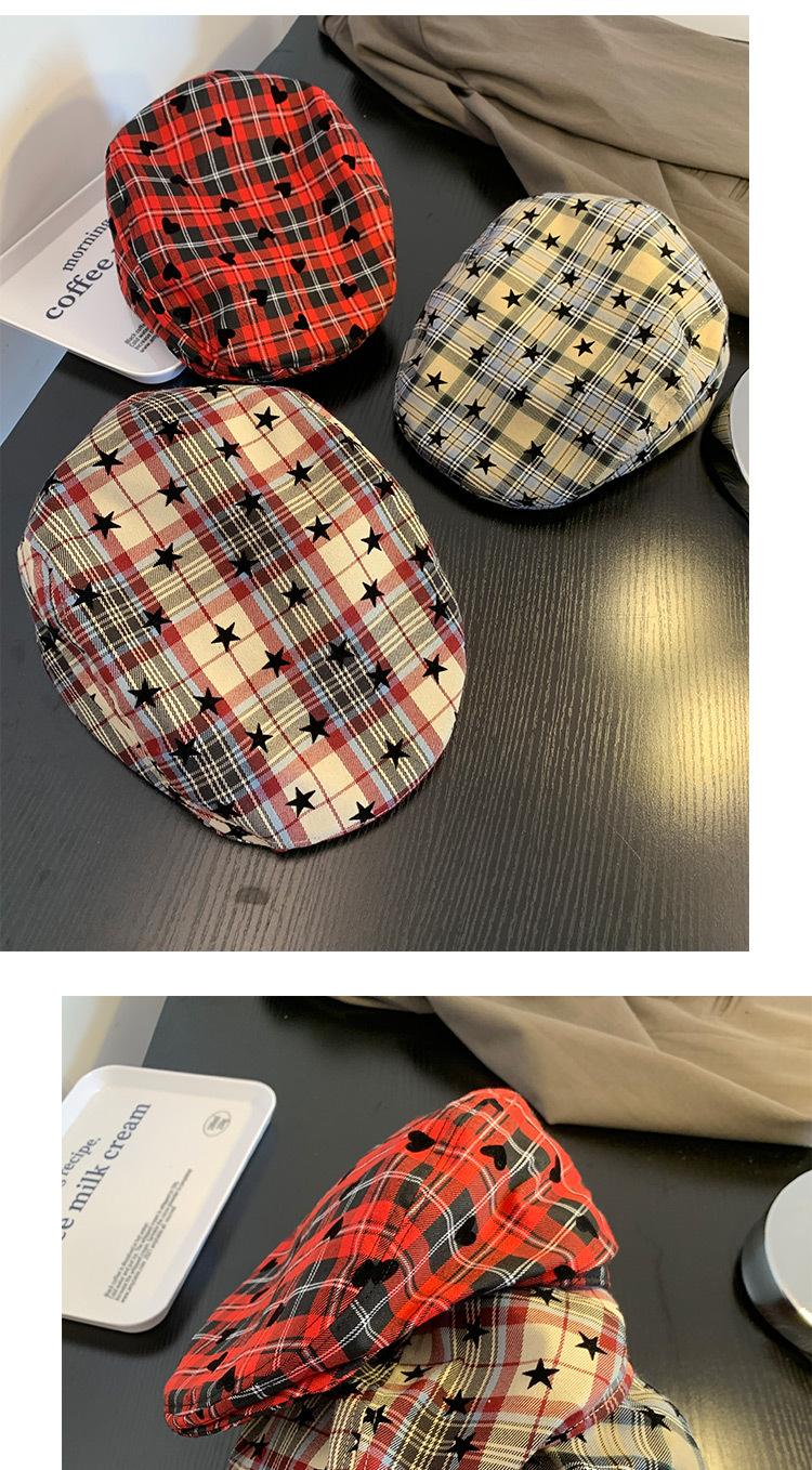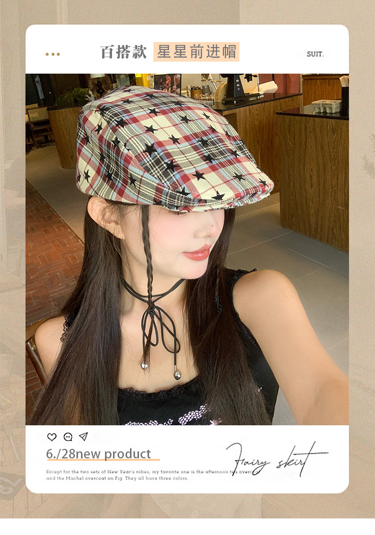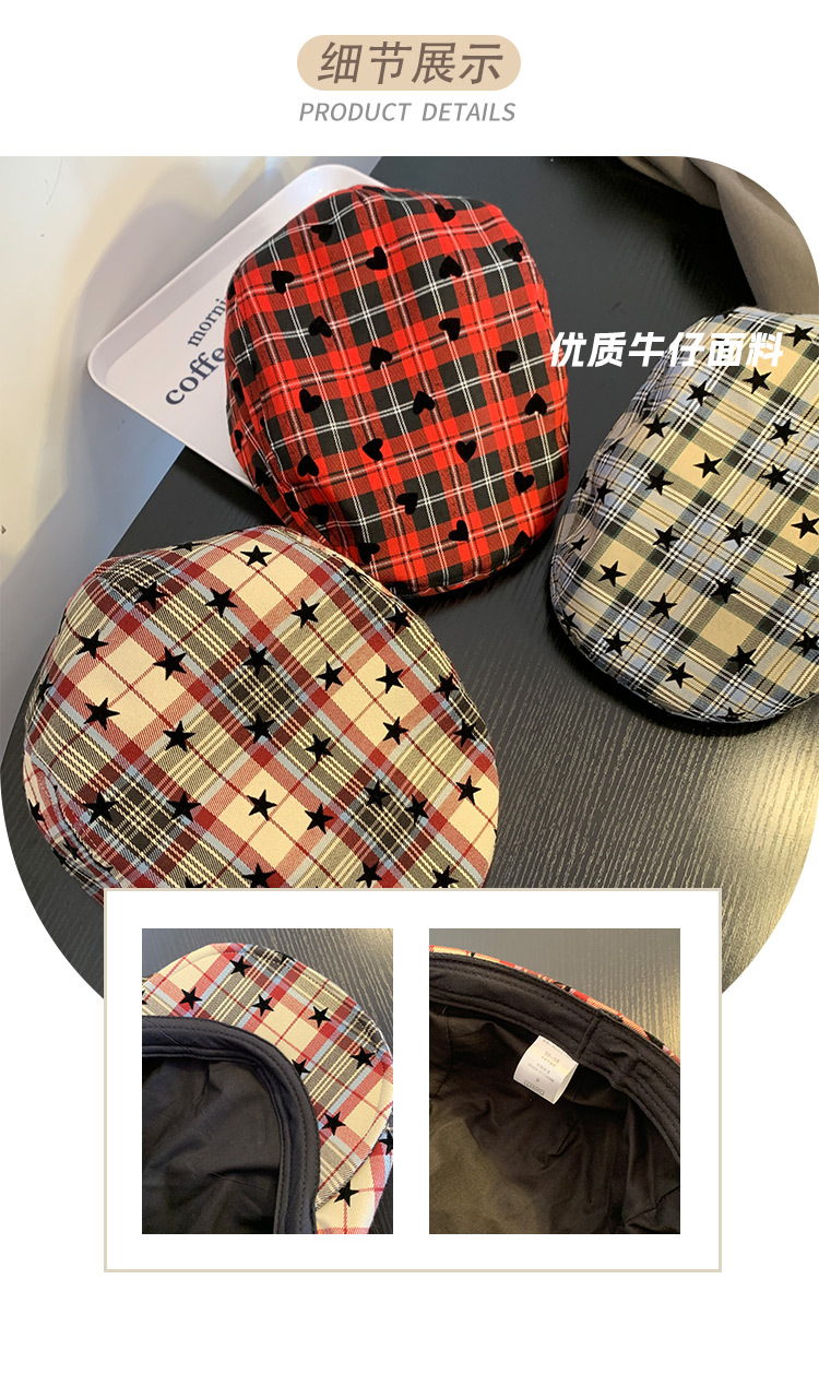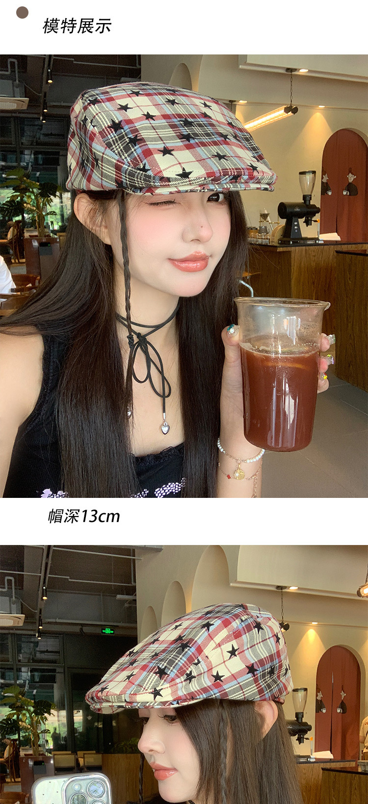 日系星星格子前进帽女复古y2k显脸小贝雷帽百搭大头围画家帽子潮