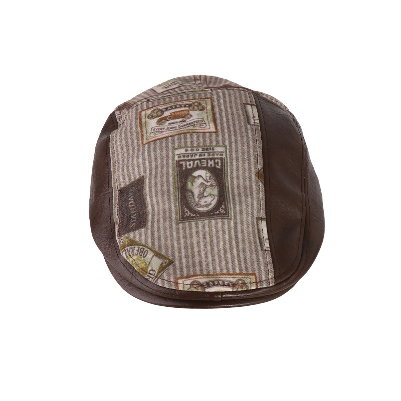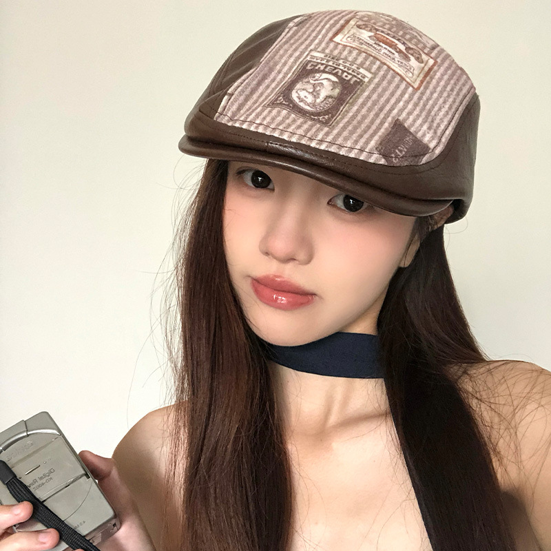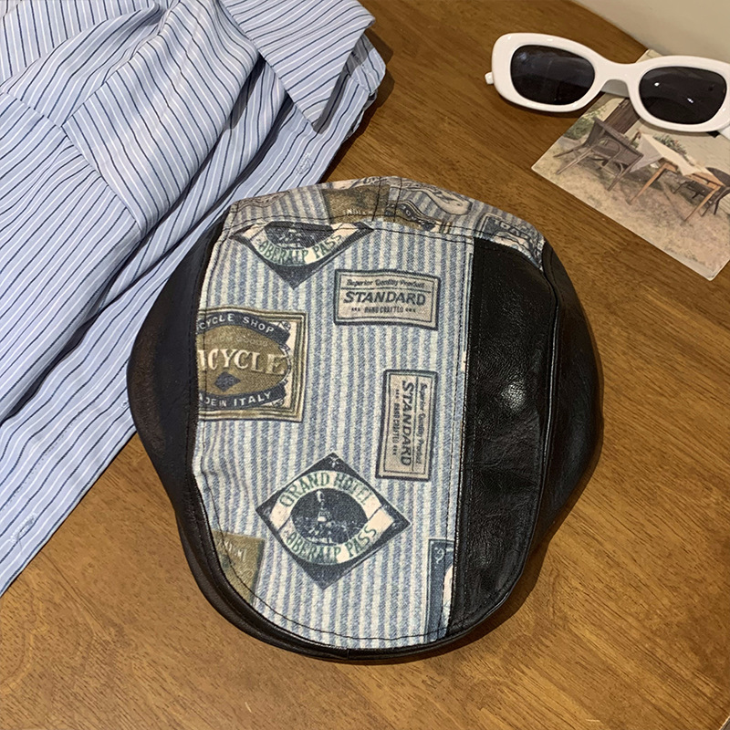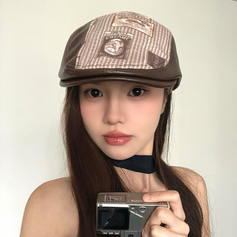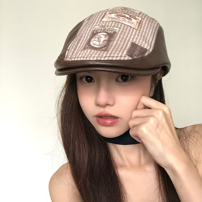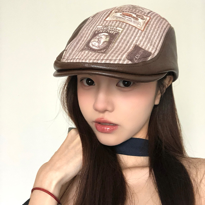 美式复古辣妹印花PU皮质前进帽女百搭小众文艺英伦反戴贝雷帽子潮