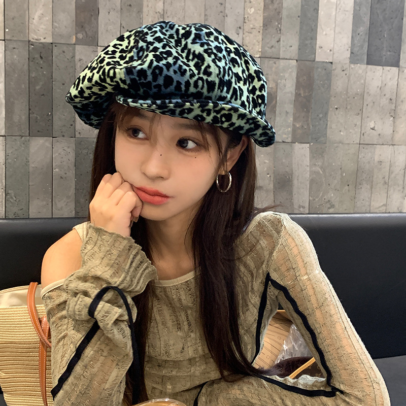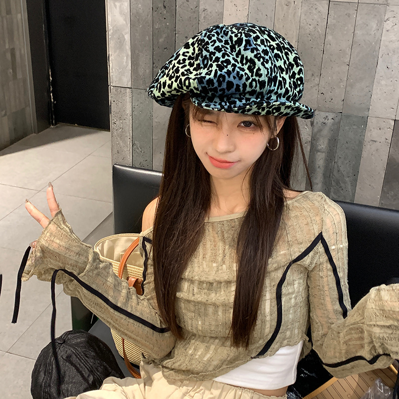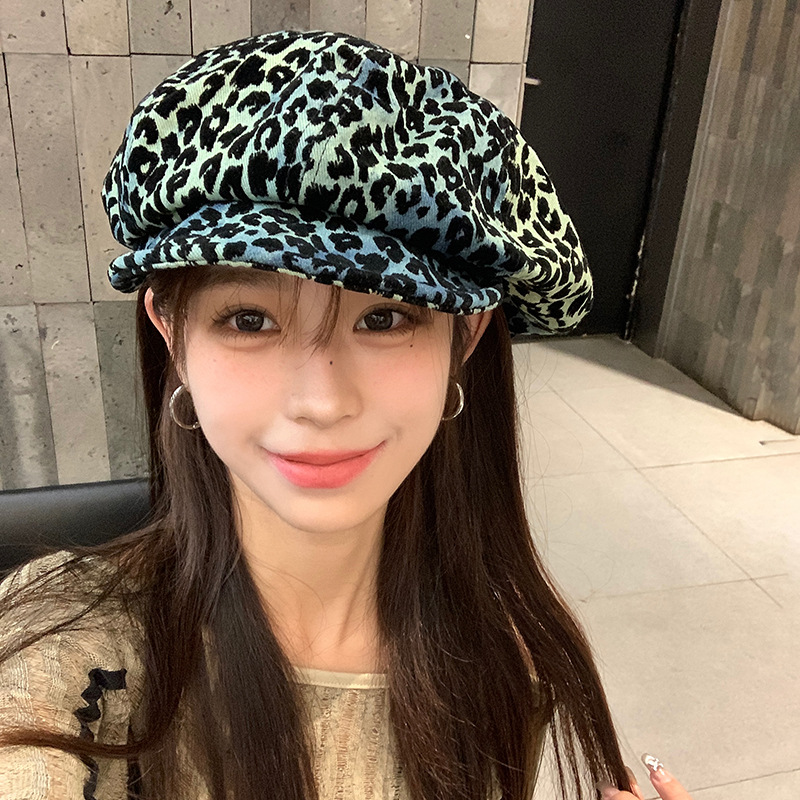 千禧辣妹小众设计感复古豹纹云朵贝雷帽女大头围潮酷显脸小八角帽