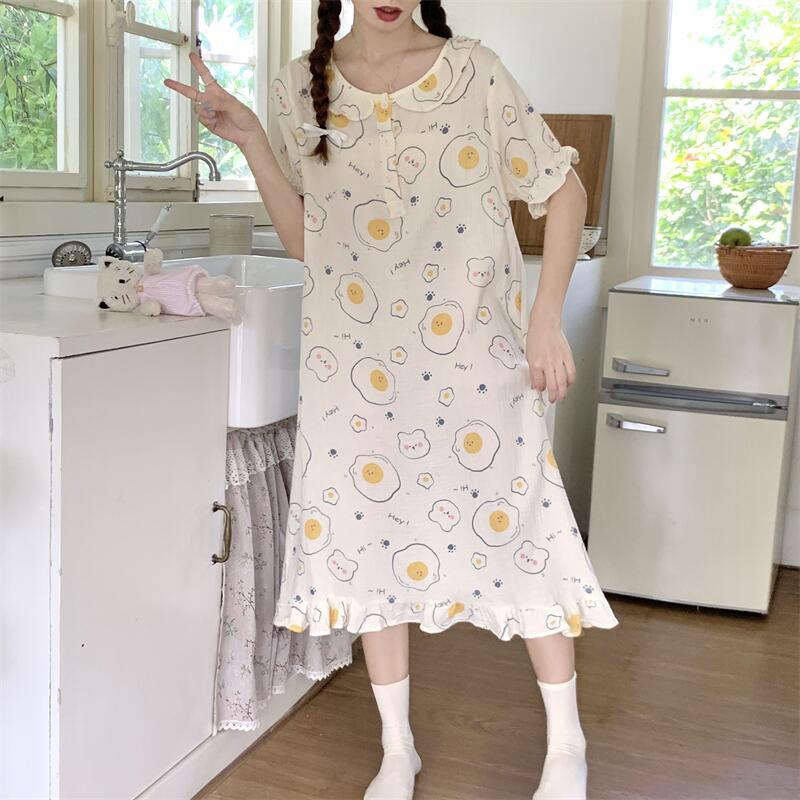 韩版纯棉双纱甜美卡通印花宽松套装睡衣连衣裙家居服