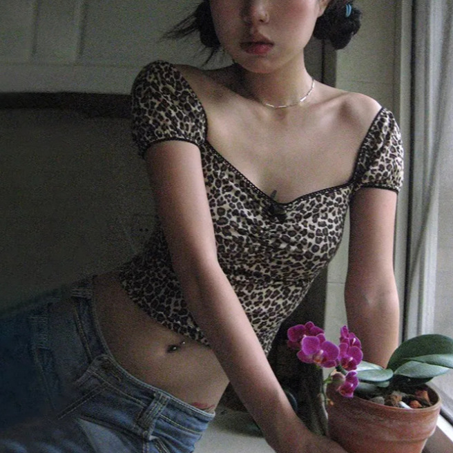 y2k亚文化豹纹上衣t恤女甜酷辣妹修身显瘦一字肩短袖女装春夏新款