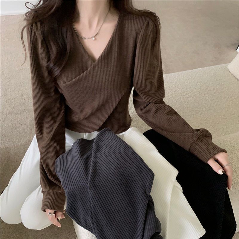 秋冬交叉v领设计感正肩T恤女长袖内搭不规则短款泡泡袖上衣打底衫