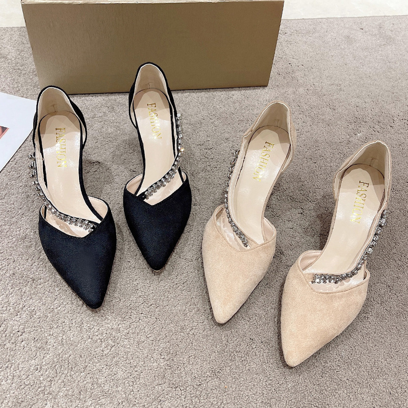 网红水钻绒面中空宴会时装鞋新款小码细跟气质礼服高跟鞋单鞋