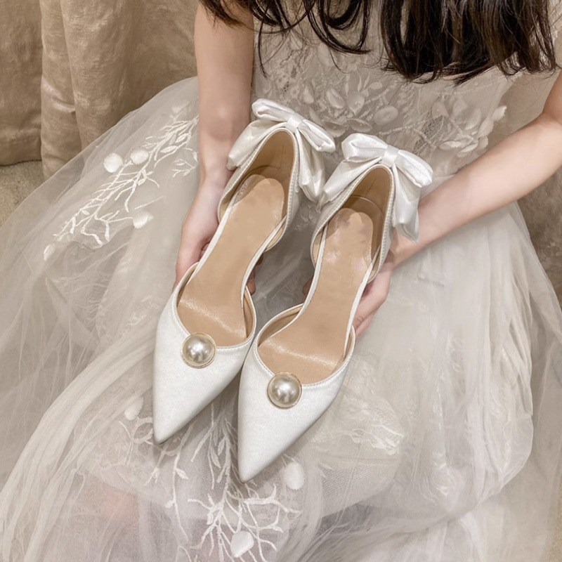 纯色浅口高跟鞋 法式缎面婚礼高跟鞋仙女风蝴蝶结婚鞋女