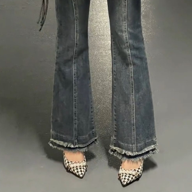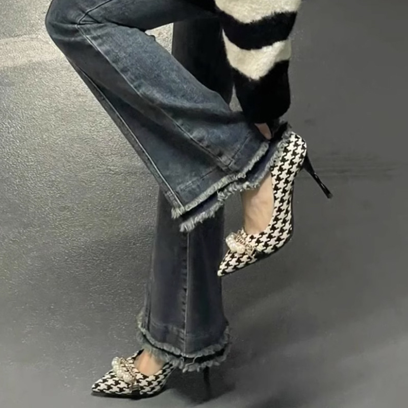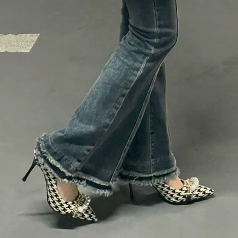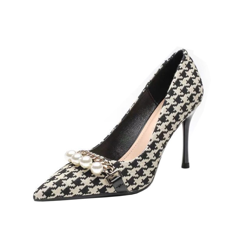 千鸟格珍珠高跟鞋尖头浅口高跟单鞋名媛风千鸟格珍珠高跟鞋女