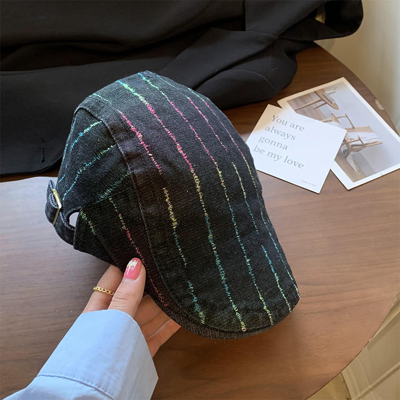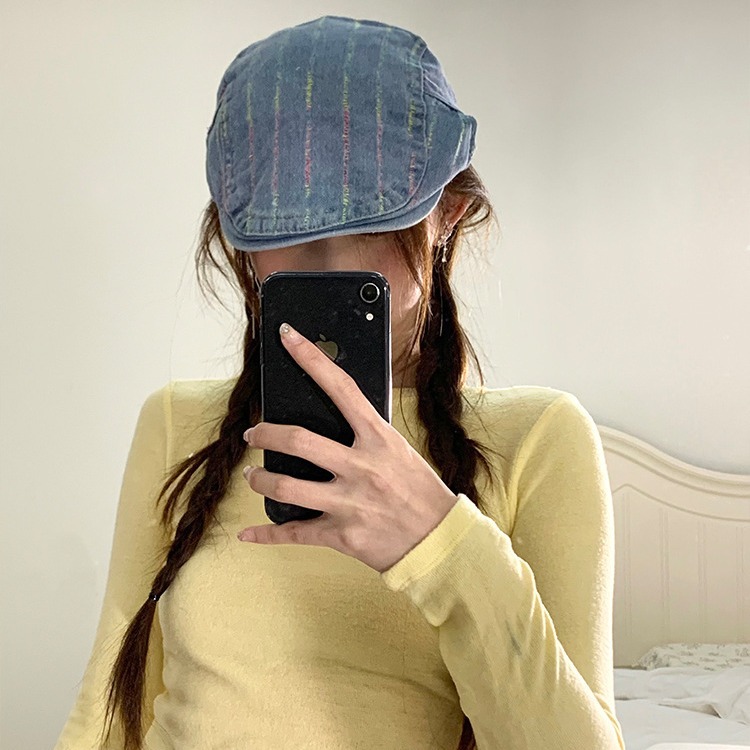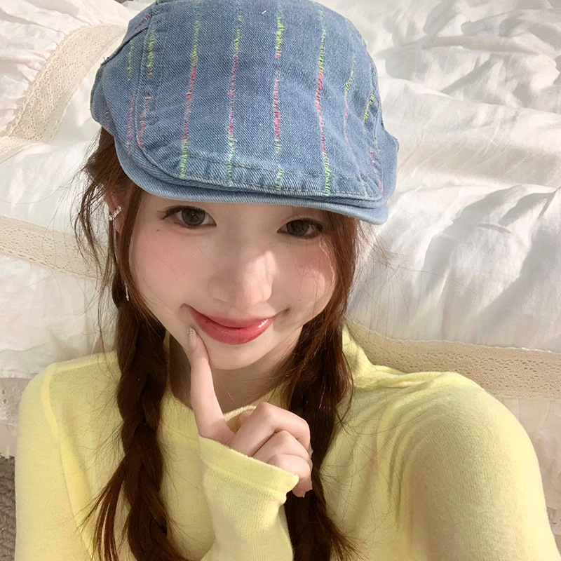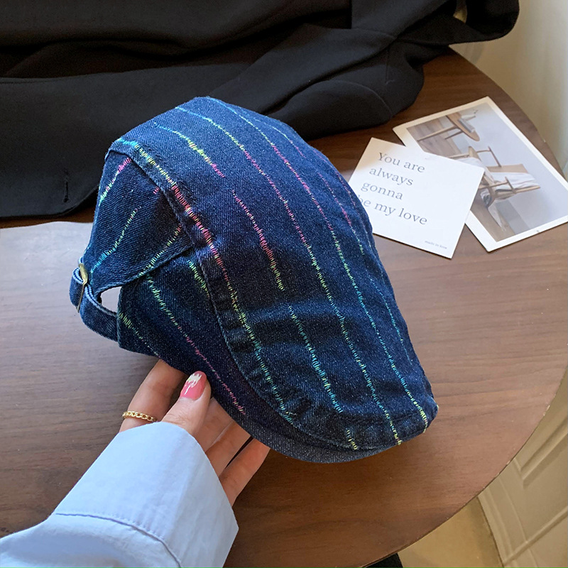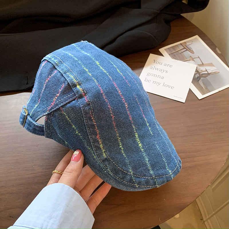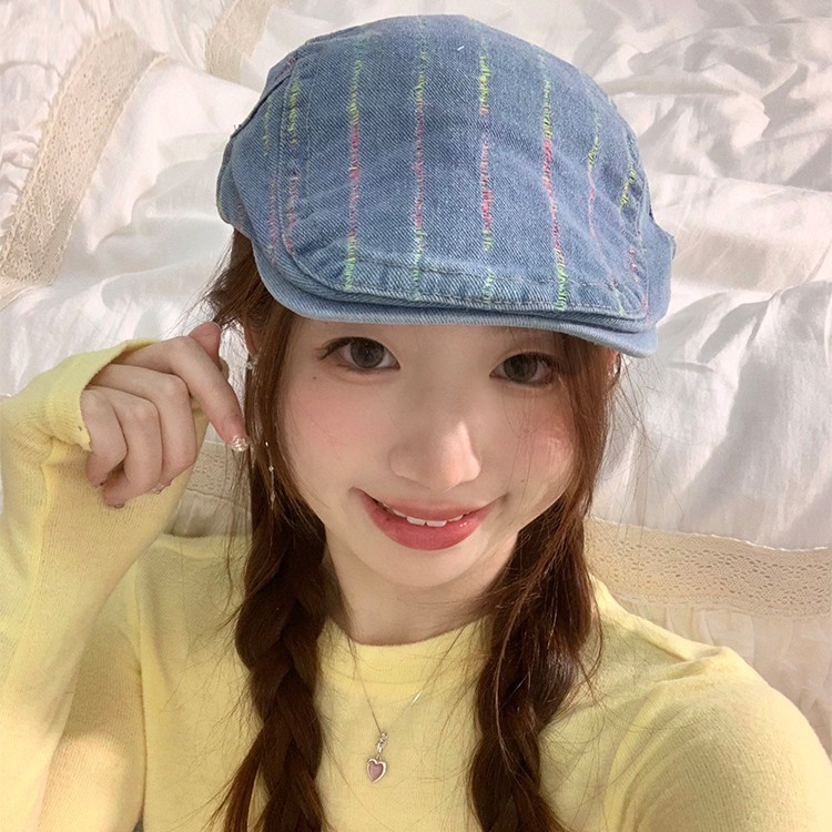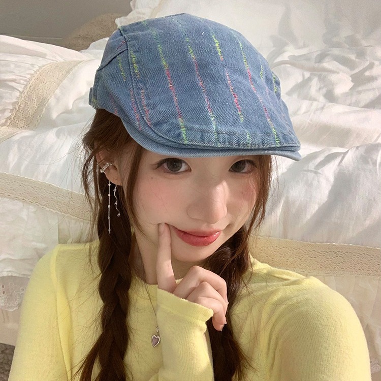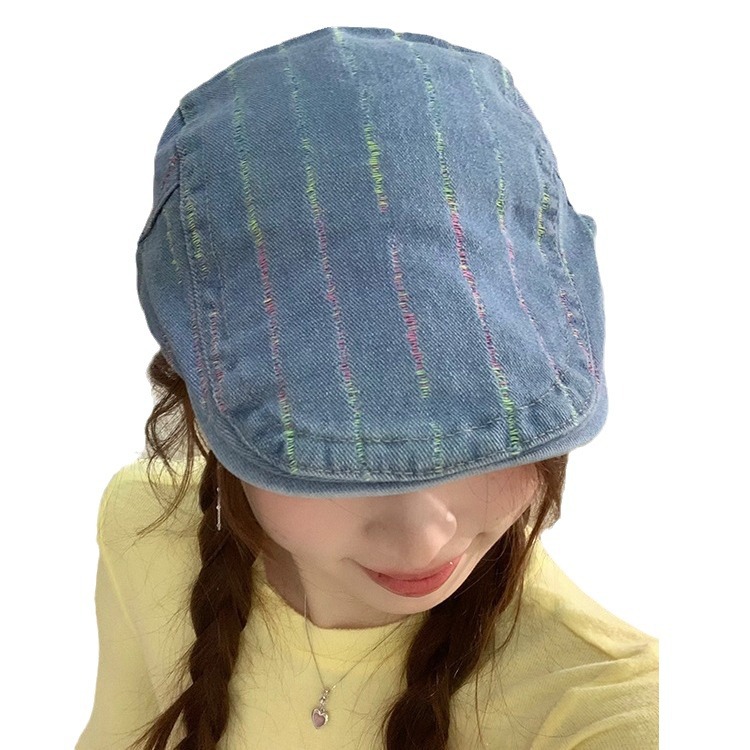 春夏季彩色条纹牛仔贝雷帽女小众美式复古反戴前进帽遮阳报童帽子