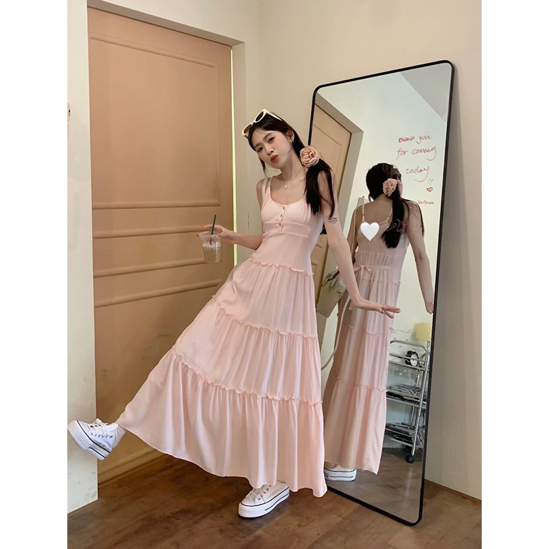 粉色吊带连衣裙女夏季新款掐腰裙小个子法式温柔风a字裙长裙
