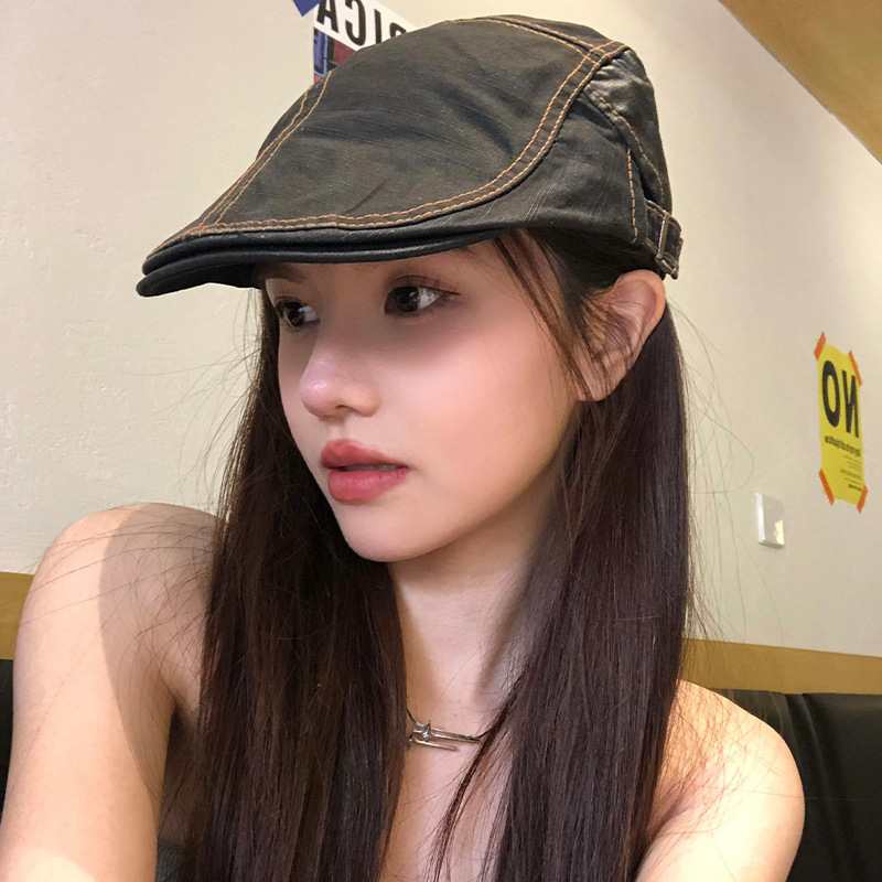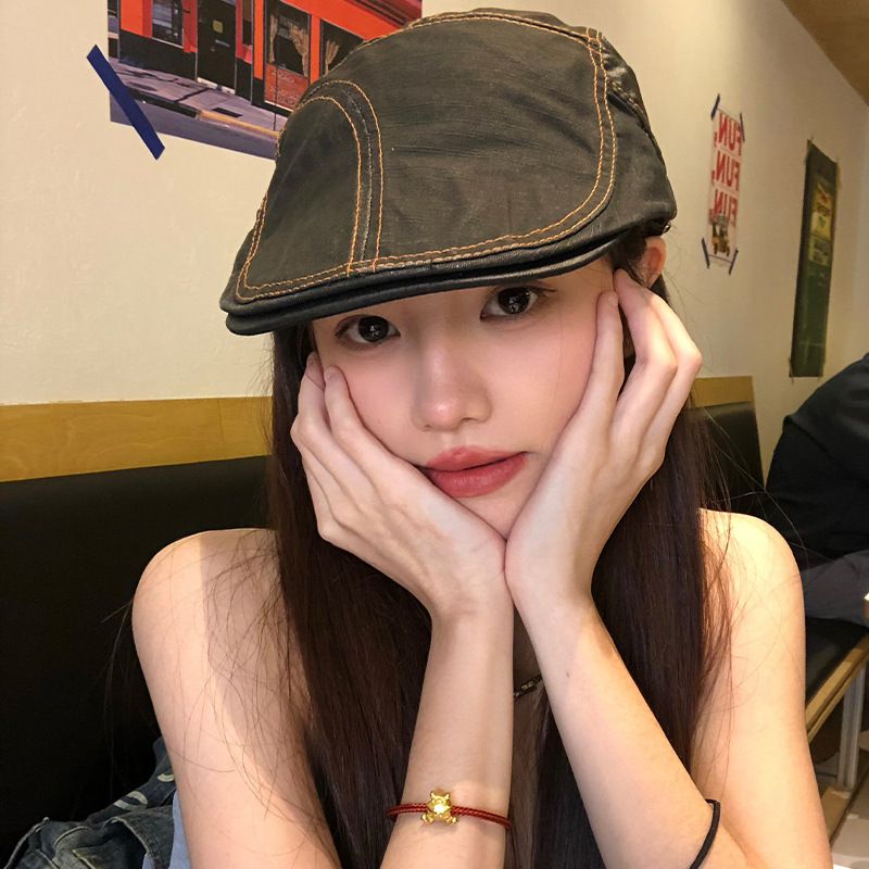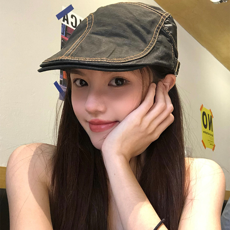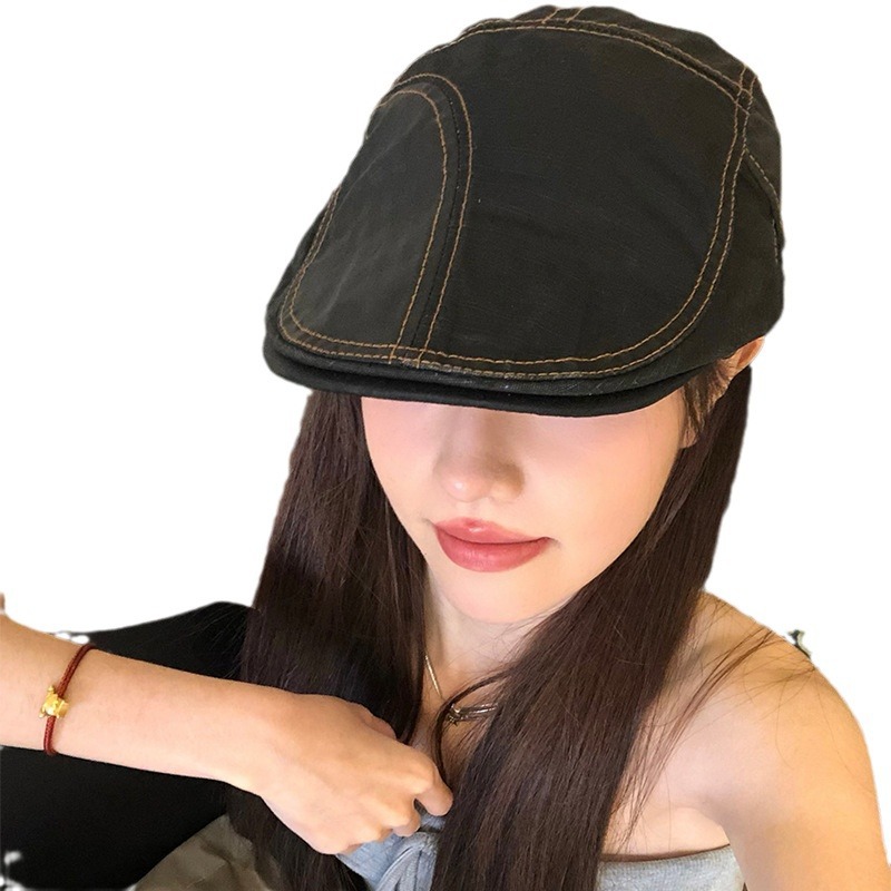 新款日系复古拼接前进帽女韩系ins显脸小夏季薄款黑色贝雷帽