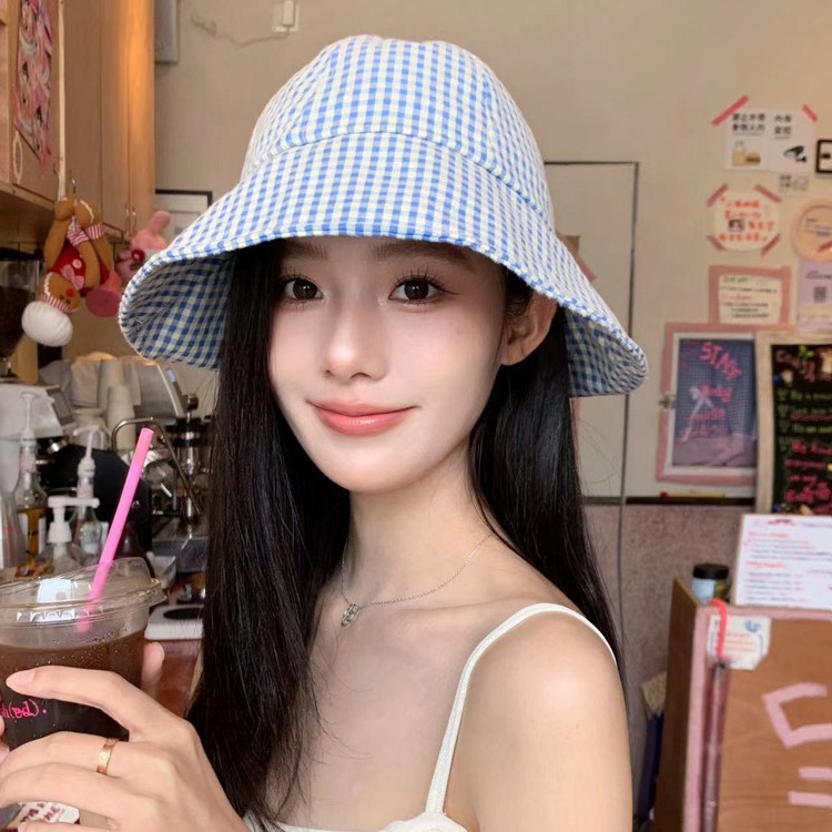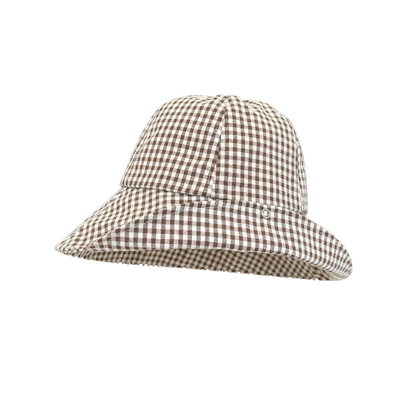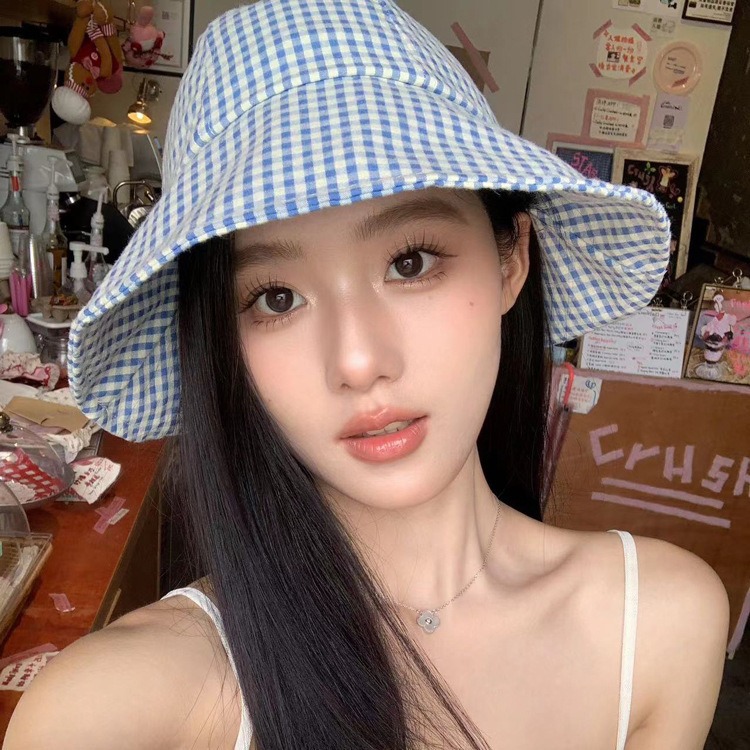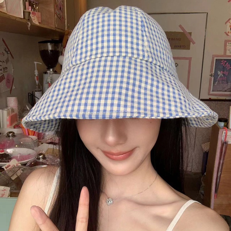 新款小格子圆顶盆帽女夏季出游防晒遮阳帽翻檐渔夫帽太阳帽子