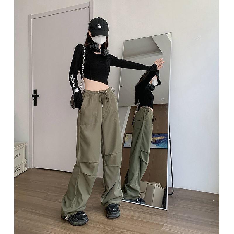 军绿色工装裤女春秋新款休闲美式阔腿运动夏薄款降落伞裤子