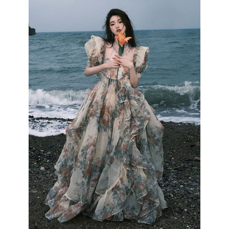 夏季超仙连衣裙法式泡泡袖海边公主裙仙女拍照生日裙度假裙长裙