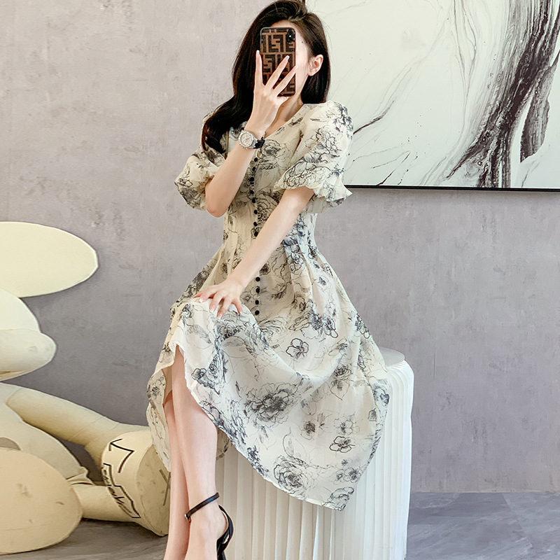 法式印花优雅气质高级感收腰中长连衣裙夏新外贸裙