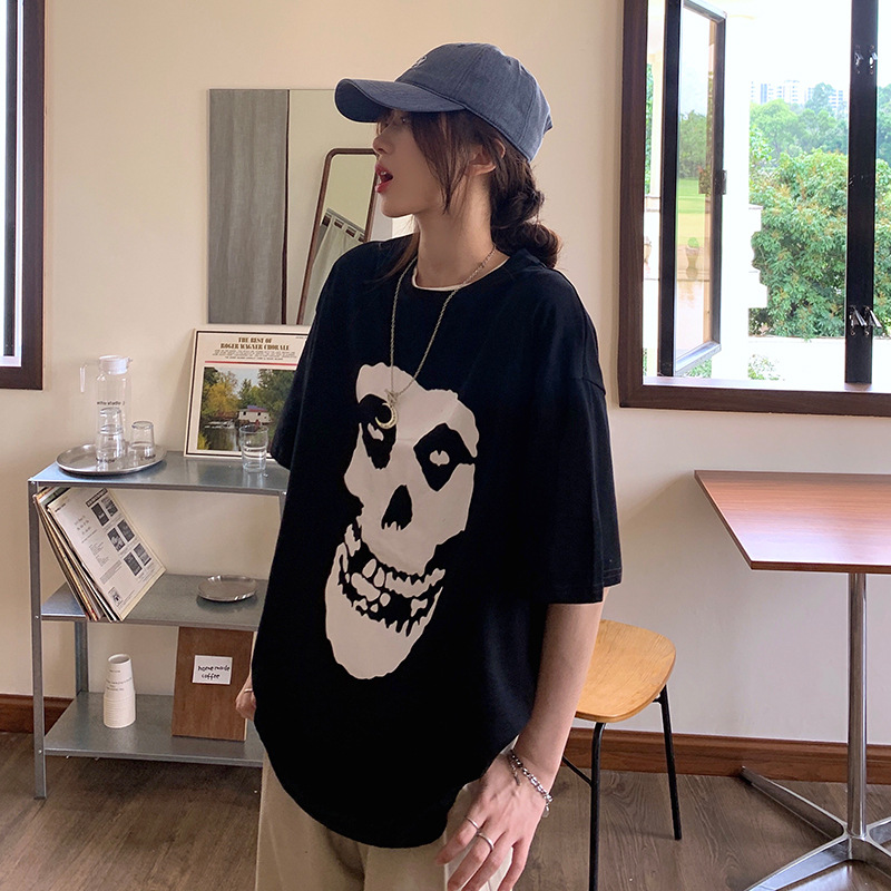 美式复古个性街头暗黑骷髅头印花T恤女夏季欧货短袖宽松圆领上衣