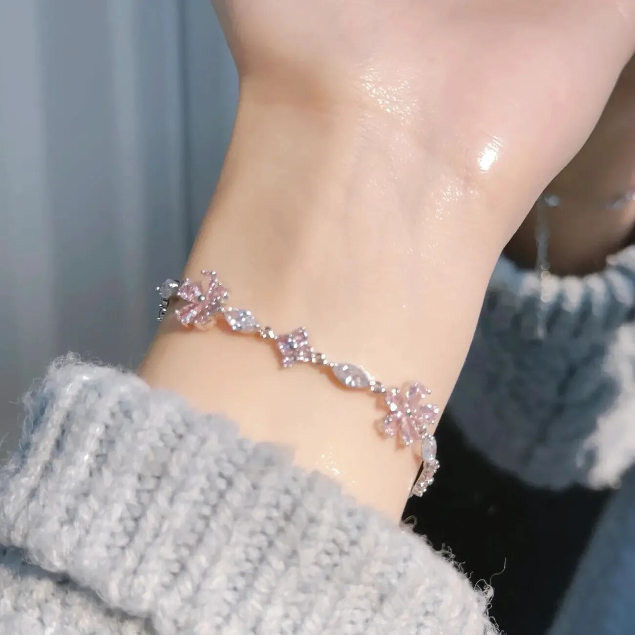 银色锆石粉色花朵手链轻奢小清新花朵手链淑女气质高级感女生饰品