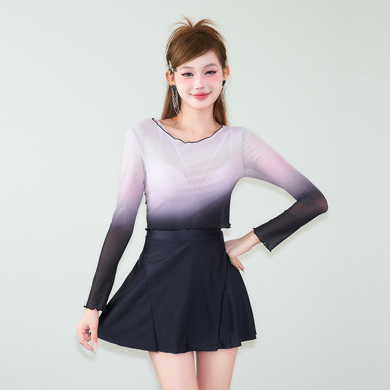 韩版新款女士连体裙式泳衣修身显瘦遮肚保守小胸聚拢长袖防晒泳衣