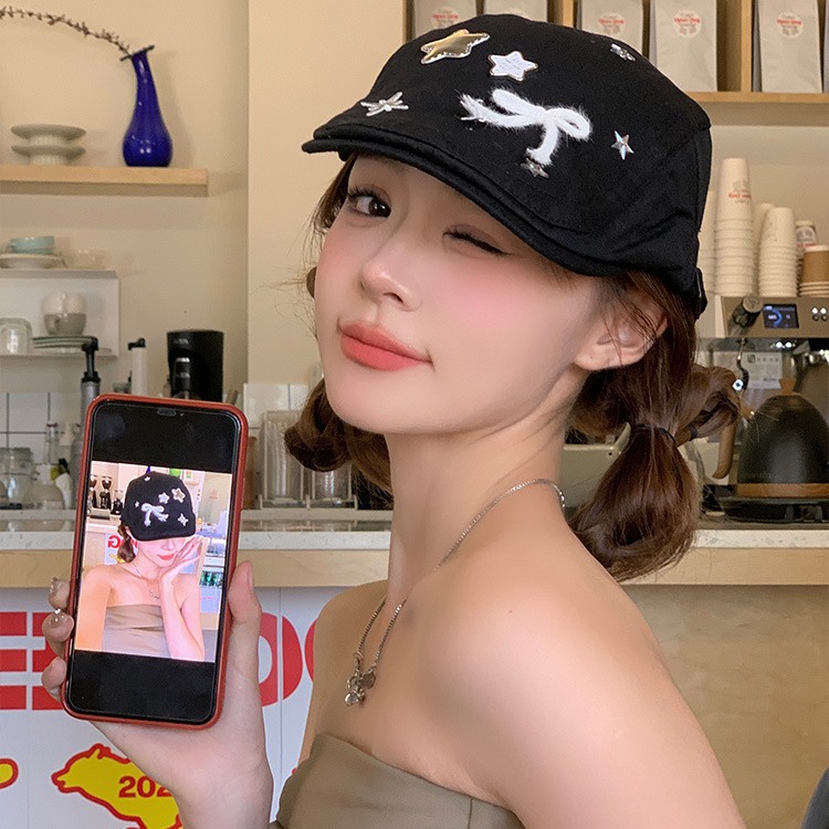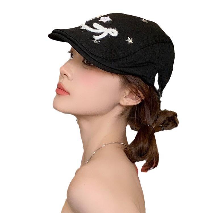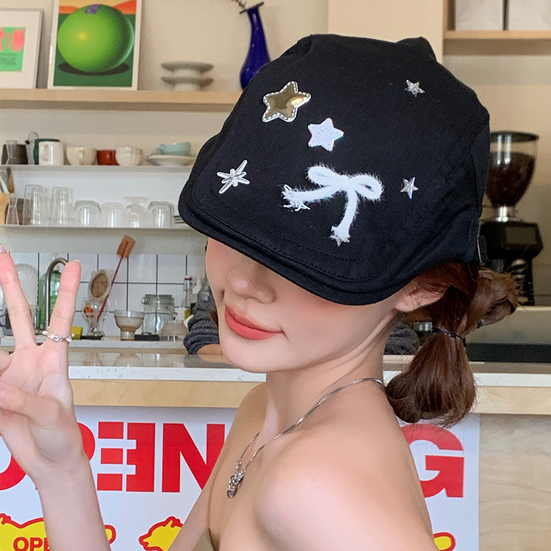 星星蝴蝶结黑色贝雷帽女复古日系百搭前进帽显脸小画家帽子潮