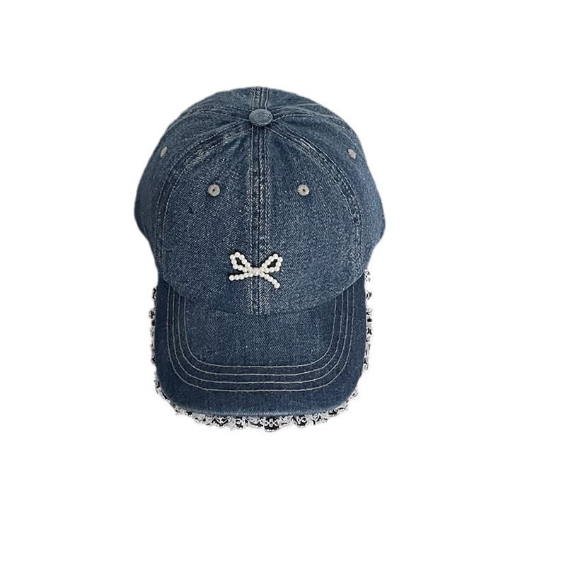 韩版蕾丝花边牛仔棒球帽女大头围显脸小鸭舌帽立体珍珠蝴蝶结帽子