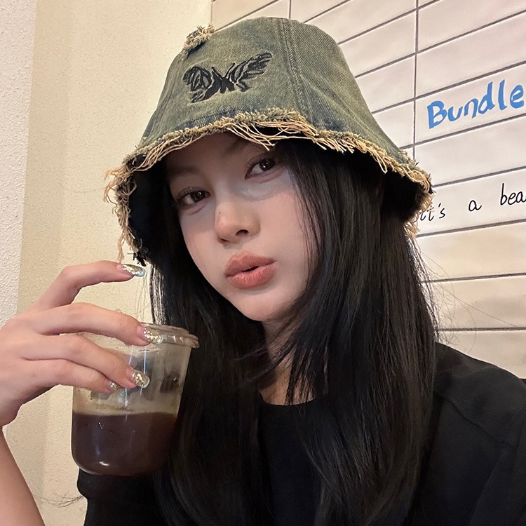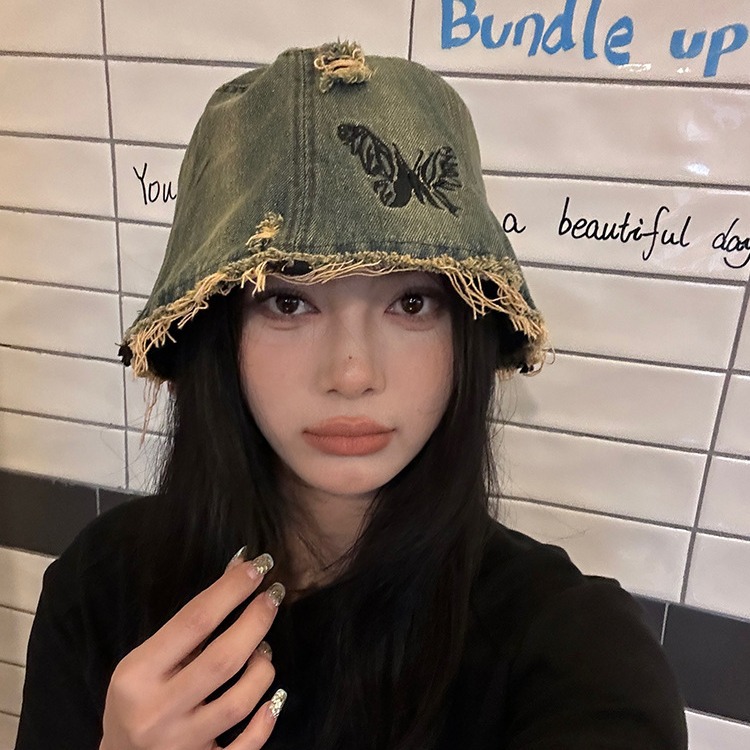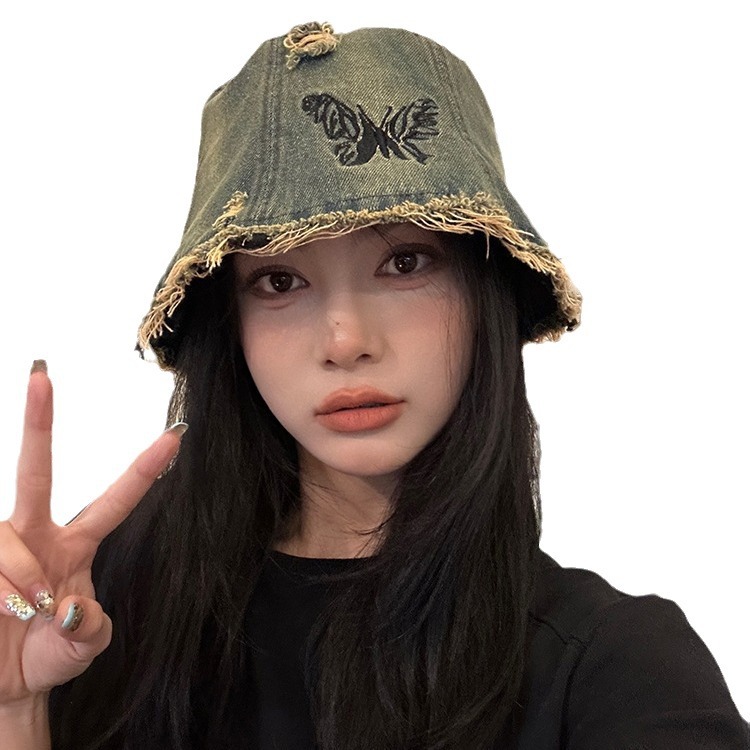 韩版复古刺绣蝴蝶牛仔渔夫帽女大头围显脸小水洗做旧水桶帽子新款