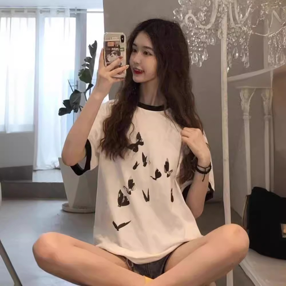 白色蝴蝶印花短袖t恤女夏季多巴胺穿搭韩版宽松百搭上衣