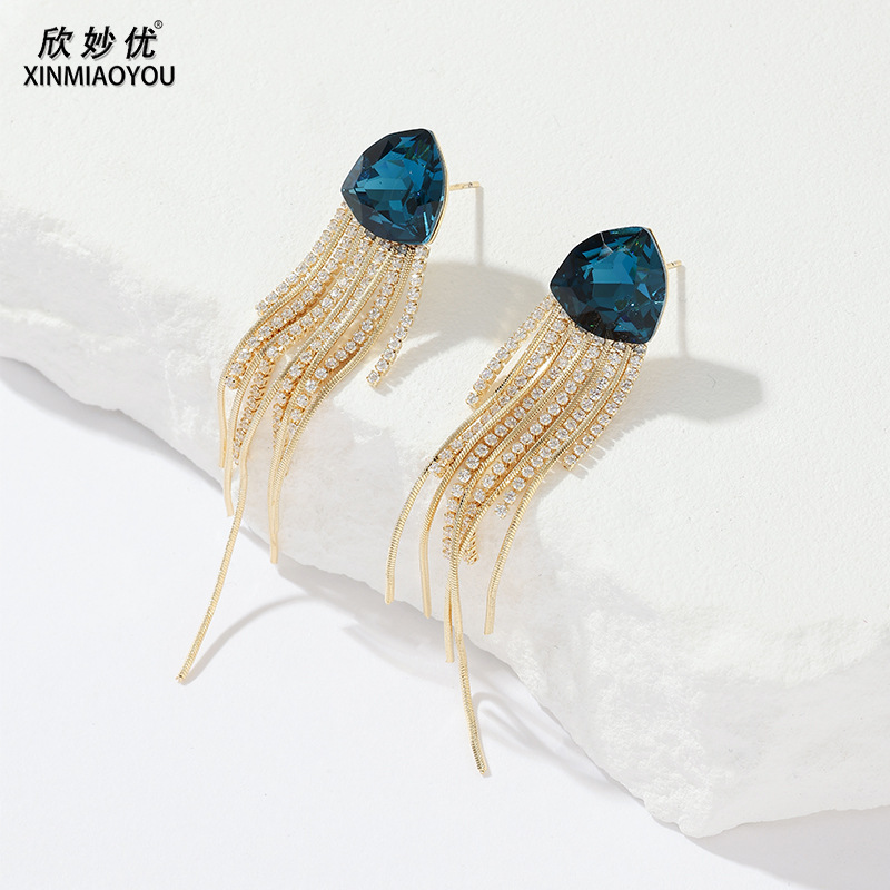 铜微镶锆石蓝水晶三角耳环