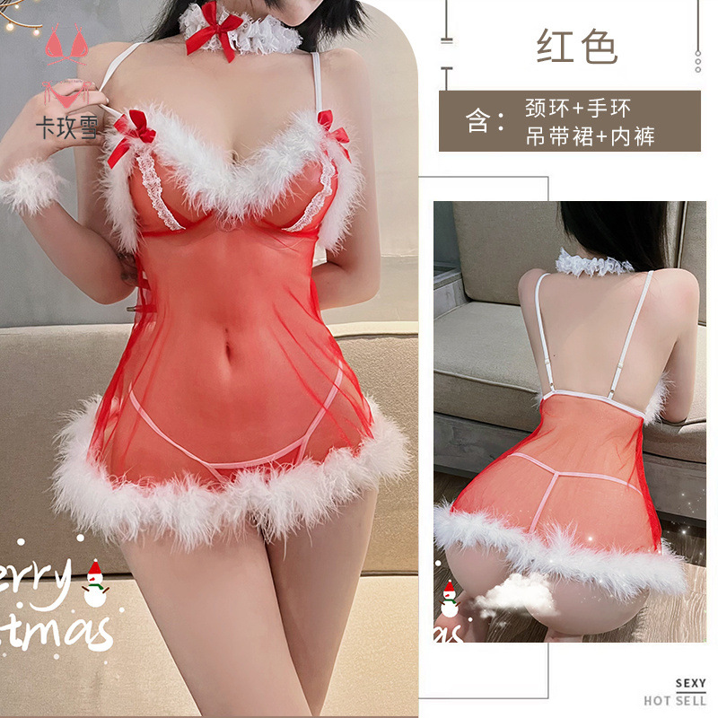 情趣内衣新款甜美圣诞装性感毛茸少女透视吊带睡裙套装