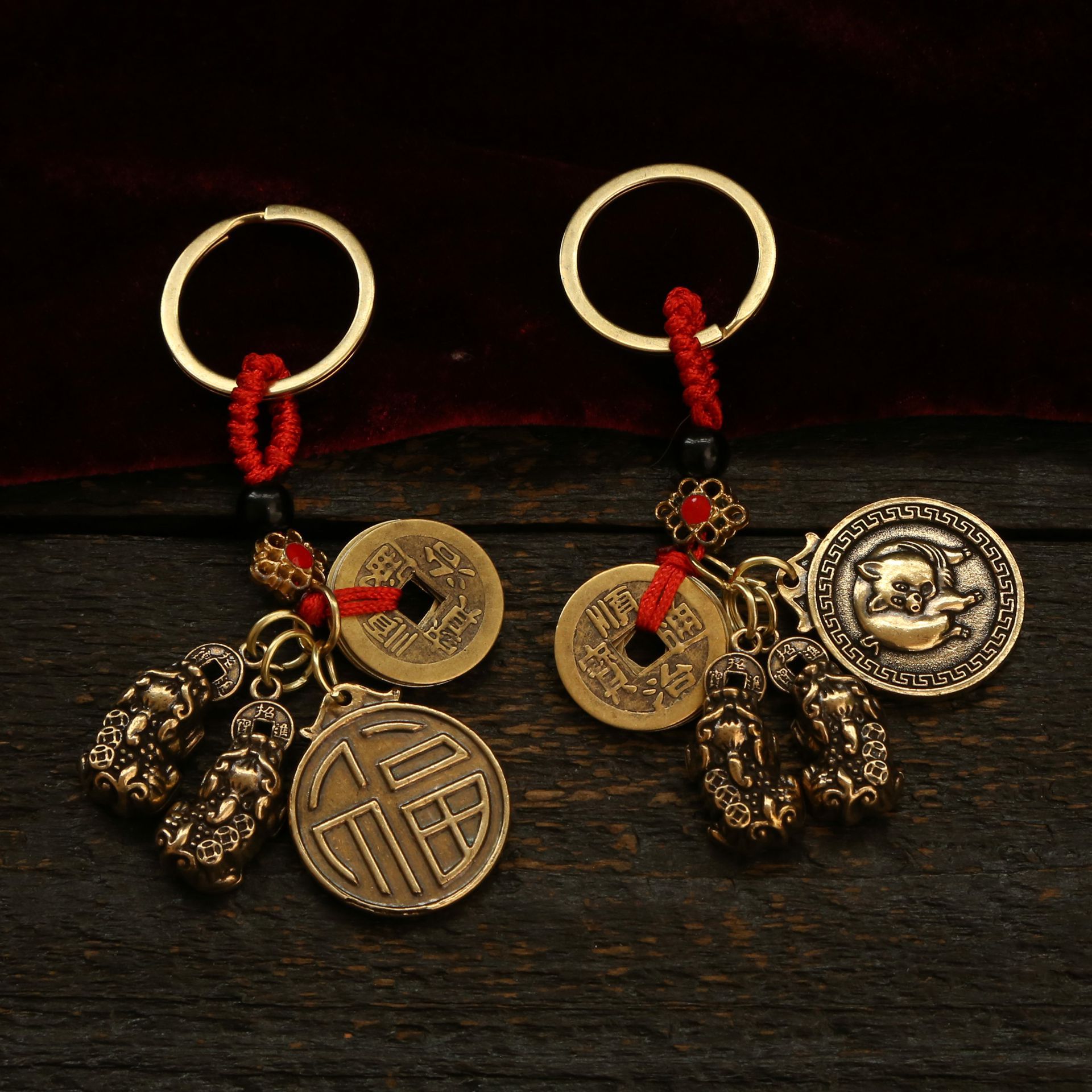 黄铜生肖福牌双貔貅红绳钥匙扣挂件 男女汽车钥匙包包挂饰配件