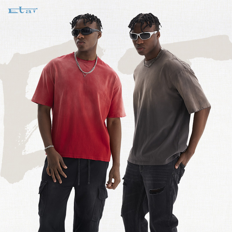 休闲街头水洗渐变T恤100%棉复古做旧T恤高品质喷马骝渐变褪色短袖